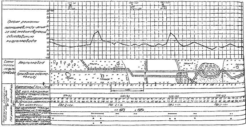 ПРИЛОЖЕНИЕ 2ПРИМЕРзаполнения формы 1 при проведении обследования коррозионного состояния магистрального нефтепровода Задание: провести обследование коррозионного состояния участка магистрального нефтепровода (название нефтепровода). Характеристика нефтепровода (заносится в форму 1) (рис. П.1): название нефтепровода, протяжённость обследуемого участка 50 км (начало 70 км, окончание 20 км); диаметр и толщина стенки трубы - 529 × 9,0 мм; год пуска нефтепровода в эксплуатацию - 1972, год проведения последнего капитального ремонта - 1985, (участок 85 - 93 км); тип изоляции - поливинилхлоридная пленка (ПВХ) в 2 слоя; год нанесения изоляции - 1972, на участке 85 - 93 км - 1985; сквозные проржавления были обнаружены в 1983 г. (86 км) и 1984 г. (91 км); капитальный ремонт с частичной заменой труб на участке 85 - 93 км был проведен в 1985 г.; участок нефтепровода с 77,5 по 106 км проложен в зоне действия блуждающих токов, электрифицированная железная дорога идет на этом участке параллельно нефтепроводу, пересекая его на 89,7 км. По этим данным на рабочей схеме трассы отмечены линией участки, где были обнаружены сквозные проржавления (86 и 91 км). Величина удельного сопротивления грунта (минимальное и максимальное значение на км) взята из проектных данных. На 81 - 82, 99 - 101 км (участки с низким удельным сопротивлением) были проведены замеры с целью уточнения проектных данных. Эти участки выделены линией на рабочей схеме. Участок нефтепровода обеспечен электрохимзащитой: две станции катодной защиты ТСКЗ-3,0 и установкой дренажной защиты - ДВП-300. Анализ работы средств ЭХЗ показал, что 1983 и 1984 годы имели место простои электродренажа, чем, очевидно, объясняются сквозные коррозионные проржавления на нефтепроводе (86 и 91 км). График величины разности потенциалов «труба-земля» показал недозащиту на участках 80 - 83 и 99 - 101 км и наличие опасности электрокоррозии (величина разности потенциалов на этих участках меньше минимально допустимого значения, равного 0,85 В). Эти участки выделяем линией на рабочей схеме. При обследовании состояния изоляционного покрытия было выявлено, что общее состояние изоляции удовлетворительное (переходное сопротивление изоляции не ниже 104 Ом · м2, однако в покрытии имеются дефекты различных размеров, в среднем 3 дефекта на километр. Дефекты наибольшего размера (в условных единицах) обнаружены на следующих участках: