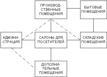 ТАБЛИЦА 1 ВАРИАНТЫ СХЕМ ФУНКЦИОНАЛЬНЫХ СВЯЗЕЙ ГРУПП ПОМЕЩЕНИЙ В ОТДЕЛЬНО СТОЯЩИХ ЗДАНИЯХ 3.2. ПРЕДПРИЯТИЯ, ВСТРОЕННЫЕ И ВСТРОЕННО-ПРИСТРОЕННЫЕ К ЖИЛЫМ ДОМАМ3.2.1. Для встроенных и встроенно-пристроенных предприятий ввиду их относительно меньшей вместимости и более простых технологических процессов, характерно совмещение ряда функций в одном помещении. Во встроенных предприятиях вместимостью до 200 м2 общей площади производственные помещения могут быть объединены в одном объеме со складскими помещениями, салоны для посетителей - с производственными помещениями, салоны - с производственными и складскими помещениями, согласно требованиям п.4.1.3. «Пособие к МГСН 4.18-99 выпуск 1». 3.2.2. Функциональные связи групп помещений во встроенных и встроенно-пристроенных предприятиях строятся по тем же принципам, что и в отдельно стоящих зданиях. Варианты схем функциональных связей групп помещений встроенных и встроенно-пристроенных предприятий бытового обслуживания приведены в таблице 2. Вариант 1 включает все 4 основные группы помещений: салон для посетителей, производственные помещения, складская группа и служебно-бытовые помещения. Дополнительная группа объединена с салоном для посетителей. Этот вариант характерен для ателье по пошиву и ремонту одежды, головных уборов и трикотажных изделий, ателье-магазинов, мастерских ремонта обуви, бытовых машин и приборов. Вариант 2. Совмещены производственная и складская группы помещений, а также салон для посетителей и дополнительные службы. Это вариант характерен для парикмахерских, некоторых мастерских ремонта и пр. Вариант 3. Совмещены салон для посетителей, производственная группа (частично) и дополнительные помещения, а также складская с производственной (частично). Этот вариант характерен для небольших парикмахерских, бюро посреднических услуг, многоотраслевых комплексных приемных пунктов типа «Мультисервис» и пр. Вариант 4. Отсутствует производственная группа и дополнительные помещения. Этот вариант характерен для приемных пунктов прачечных, химчисток и ателье проката предметов домашнего обихода. ВАРИАНТ 1