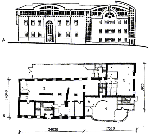 НАСЕЛЕНИЯ А Фасад Б. План первого этажа 1 - холл для посетителей, 2 - помещения чистки одежды, 3 - стиральный цех, 4 - зал парикмахерской и салон для посетителей, 5 - кабинет, 6 - подсобные помещения, 7 - санитарные узлы