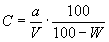а - содержание вещества в анализируемой пробе, найденное по градуировочному графику, мкг; V - объем воздуха, отобранного для анализа и приведенного к стандартным условиям, л (см. приложение 1); W - потеря в массе при высушивании;