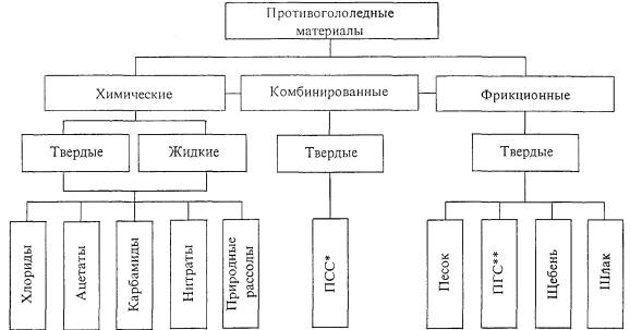 Классификация противогололедных материалов *) ПСС - пескосоляная смесь. **) ПГС - песчано-гравийная смесь. К комбинированным относят материалы, обладающие химическими и фрикционными свойствами, в которых количество соли (чаще всего NaCl) по отношению к фрикционному материалу составляет не менее 5 %. При содержании соли менее 5 % ПГМ относят к фрикционной группе, так как в этом случае он применяется с целью повышения шероховатости снежно-ледяного слоя покрытия. 5.4. Химические ПГМ (реагенты) выпускают в твердом, жидком и смоченном виде. Сырьем для получения этих материалов чаще всего являются природные источники (бишофит, галит и др.) или отходы промышленности (сильвинитовые, карнолитовые и др.). С целью снижения расхода твердых химических ПГМ их смачивают растворами солей с пониженной точкой замерзания. Эти ПГМ называют «смоченные соли». По химическому составу ПГМ этой группы разделяют на четыре подгруппы: - первая подгруппа - хлориды (хлористый натрий, хлористый кальций, хлористый магний и ПГМ на их основе); - вторая подгруппа - ацетаты (ацетат аммония, ацетат калия, ацетат кальция и ПГМ на их основе); - третья подгруппа - карбамиды (мочевина, карбамидно-аммиачная селитра и ПГМ на их основе); - четвертая подгруппа - нитраты (нитрат кальция, нитрат магния и ПГМ на их основе). 5.5. Краткая характеристика химических ПГМ 5.5.1. Первая подгруппа - хлориды. К этой подгруппе относятся ПГМ на основе NaCl, СаСl2 и MgCl2: - ХКМ - хлористый кальций модифицированный, ингибированный. Выпускается в жидком виде по ТУ 2149-026-13164401-98 «Жидкий противогололедный состав ХКМ». Тр *) до -30 °С. *) Тр - допустимая рабочая температура воздуха, до которой можно применять ПГМ. - Биомаг - модифицированный хлористый магний (Бишофит - MgCl2 · 6H2O), выпускается 4 марок в твердом и жидком виде по ТУ 2152-001-53561075-02 «Противогололедный материал Биомаг - ХММ». Тр до -18° - -20 °С. - ХКФ - хлористый кальций фосфатированный выпускается по ТУ 2152-057-05761643-2000 «Кальций хлористый фосфатированный». Тр до -30 °С. - Технический хлористый натрий карьерный выпускается по ТУ 2152-067-00209527-95 «Натрий хлористый технический карьерный». Тр до -12° - -15 °С. - Противогололедный материал на основе хлористого натрия выпускается по ТУ 2152-082-00209527-99 «Материал противогололедный». Тр до -12° - -15 °С. - Природные рассолы и промышленные жидкие отходы. Природные рассолы по химическому составу чаще относятся к хлористо-натриевым или хлористо-кальциево-натриевым жидким материалам. Распространены в основном в Европейской части России и используются как местные ПГМ. Тр до -12 °С. 5.5.2. Вторая подгруппа - ацетаты: - Нордикс - разработан на основе ацетата калия и выпускается для дорог двух марок, в жидком виде по ТУ 2149-002-40874358-00 «Антигололедный реагент на ацетатной основе». Тр до -40 °С. - Антиснег-1 - разработан на основе ацетата аммония и выпускается в жидком виде по ТУ 2149-001-45052508-00 «Антиснег-1» противогололедная жидкость (раствор ацетата аммония)». Тр до -35 °С. 5.5.3. Третья подгруппа - карбамиды: - КАС - карбамидно-аммиачная селитра выпускается по ТУ 2149-001-40128052-97 «Состав жидкий противогололедный». Тр до -8 °С. 5.5.4. Четвертая подгруппа - нитраты: - НКМ (АНС) - химический реагент на основе нитрата кальция и мочевины по ТУ У 6-13441912.001-97 «Реагент антигололедный гранулированный», выпускается в твердом виде по ТУ 6-03-349-73. Тр до -10 °С. НКММ - реагент разработан на основе нитрата кальция, магния и 