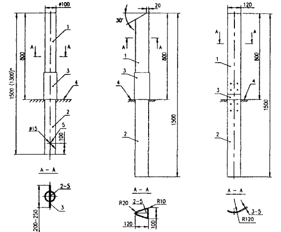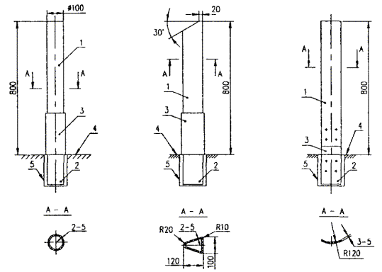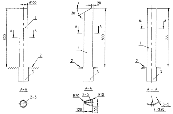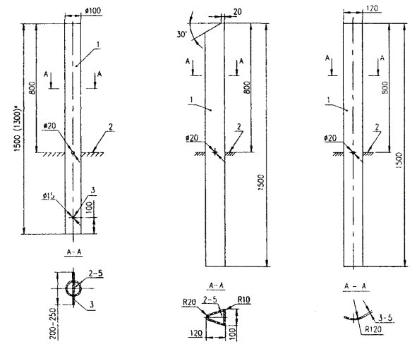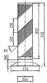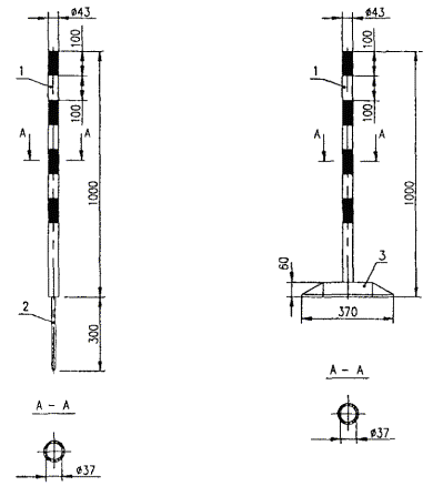3.2. Технические параметры прямоугольных пластин3.2.1. Направляющие устройства в виде пластин прямоугольных состоят из щитка, закрепленного на утяжеленной опоре. Крепление щитка к опоре осуществляется через гибкую вставку, которая позволяет восстанавливать форму пластины после наезда автомобиля и продолжать ее дальнейшую эксплуатацию (рис. 6). Рис. 6. Форма и размеры ударобезопасной пластины прямоугольной из композиционных материалов с гибким элементом 3.2.2. Направляющее устройство в виде пластины имеет высоту 90 - 100 см и состоит из щитка прямоугольной формы и утяжеленной опоры. 3.2.3. Размеры щитка составляют: высота 80 см, ширина 20 - 25 см. 3.2.4. Пластины должны иметь наклонные, под углом 45°, чередующиеся световозвращающие полосы белого и красного (оранжевого) цвета шириной 20 см по вертикали, светотехнические характеристики которых должны удовлетворять требованиям табл. 1 и 2. 3.3. Технические параметры вех стержневых3.3.1. Направляющее устройство в виде вехи стержневой состоит из трубчатого корпуса и утяжеленной опоры. Вместо утяжеленной опоры веха может с нижней стороны иметь металлический заостренный стержень. 3.3.2. Высота вехи должна составлять 120 - 150 см. Длина заостренного стержня - 30 см. 3.3.3. Веха должна иметь горизонтальные чередующиеся полосы красного и белого цвета шириной 10 см. 3.3.4. Конструкция верхней части корпуса вехи должна обеспечивать установку сигнального фонаря. С этой целью верх вехи должен быть в виде цилиндра с внутренним диаметром 37 мм. На рис. 7 показаны варианты жесткой конструкции вехи, на рис. 8 - гибкой. Рис. 7. Форма и размеры ударобезопасных направляющих устройств типа вехи стержневой жесткой конструкции из композиционных материалов: 1 - корпус вехи; 2 - штырь; 3 - жесткая утяжеленная опора; Цвета разметки: