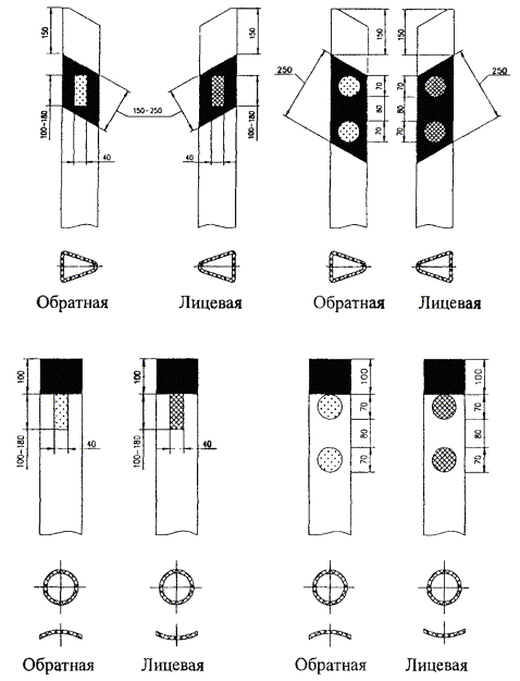 Примеры вертикальной разметки сигнальных столбиков различной формы приведены на рис. 5. Рис. 5. Вертикальная разметка ударобезопасных сигнальных столбиков из композиционных материалов (лицевые и обратные стороны): Цвет разметки столбиков: Цвет