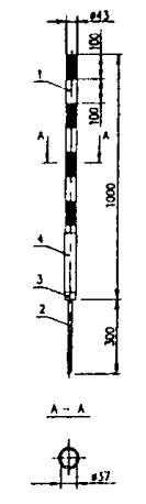 Рис. 8. Форма и размеры ударобезопасного направляющего устройства в виде стержневой гибкой конструкции из композиционных материалов: 1 - верхняя часть корпуса указателя; 2 - штырь; 3 - нижняя часть корпуса указателя; 4 - гибкий эластичный узел; Цвета разметки: