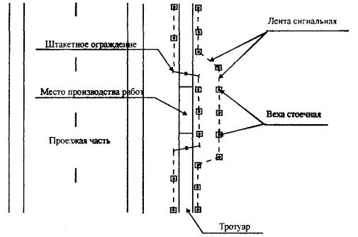 4.2.8. По границе буферной зоны пластины устанавливают на всей ее длине на расстояниях, указанных в табл. 6. 4.3. Применение вех стержневых4.3.1. Вехи стержневые применяют как средство для временной организации пешеходных путей и обозначения опасных участков в местах производства дорожных работ. 4.3.2. Обозначение временных пешеходных путей с помощью вех осуществляют путем установки их по границам организуемых пешеходных путей и крепления к ним сигнальных лент (рис. 12). В темное время суток на опасных участках, проходящих мимо глубоких разрытий, водотоков или иных опасных мест, вехи оборудуют сигнальными фонарями, которые вставляют в отверстие в верхней части вехи. 4.3.3. Обозначение границ опасных участков, находящихся в зоне производства работ (например, разрытий глубиной более 50 см), осуществляют путем размещения вех по границе опасного участка и крепления к их верхней части сигнальной ленты. Расстояние между вехами должно составлять не более 5 м. В темное время суток вехи оборудуют сигнальными фонарями. 4.3.4. При установке вех на мягкий грунт или в снег применяют вехи с металлическим штырем, который втыкают в грунт или снег. При размещении вех на твердом основании применяют вехи с утяжеленной опорой. Вехи с гибкой вставкой применяют на участках, где на веху возможен наезд транспортного средства. Рис. 12. Обозначение временного пешеходного пути с помощью вех и сигнального шнура Приложение А(справочное) ХАРАКТЕРИСТИКИ СТЕКЛОПЛАСТИКА И БАЗАЛЬТОПЛАСТИКА, ИСПОЛЬЗУЕМЫХ В КОНСТРУКЦИЯХ УДАРОБЕЗОПАСНЫХ НАПРАВЛЯЮЩИХ УСТРОЙСТВ