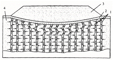 Примечание. Общая продолжительность периодов эксплуатации дороги с названной интенсивностью до одного года; меньшие значения толщин принимают для насыпей из песчано-гравийных смесей оптимального состава, большие - для насыпей из мелких непылеватых песков. Возможное снижение величины осадки насыпи на слабом основании за счет уменьшения ее неравномерности определяют в соответствии с п. 4.2.3. - поверхностная плотность не менее 500 г/м2; - отклонение поверхностной плотности от среднего значения по площади полотна не более 20 %; - ширина полотна и ширина вырезанной из него дрены должны соответствовать конструкции установки для погружения дрен и проектной длине дрен; - толщина полотна - не менее 5 мм, толщина при обжатии нагрузкой 0,05 МПа - не менее 3 мм; - прочность при растяжении - не менее 30 Н/см; - относительная деформация при разрыве - 30 ÷ 150 %; - коэффициент фильтрации в плоскости полотна при обжатии нагрузкой 0,05 МПа - не менее 30 м/сут. Вертикальные ленточные дрены из ГМ должны, как правило, достигать прочных слоев грунта под слабыми водонасыщенными грунтами - биогенными (торф, сапропель, заторфованные грунты) или минеральными (илы, глинистые грунты, мелкие пески). В плане дрены располагают по квадратной или ромбической (с углом 60°) сетке. Общее конструктивное решение представлено на рис. 4.3. Вертикальные ленточные дрены из ГМ целесообразно устраивать: - при мощности слабого слоя более 3 м на водоупоре и более 5 м на водопроницаемом основании; - при степени влажности слабых грунтов 0,8 ÷ 1, коэффициенте фильтрации не ниже 10-5 м/сут; - при соблюдении требований по критическому значению напора Нк (п. 4.2.4). 4.1.7. Защитно-армирующие прослойки из ГМ применяют при выполнении работ по уширению земляного полотна в сложных условиях: слабые основания, стесненные условия строительства. В зависимости от ставящихся целей, применяют геотекстильные материалы или георешетки (пространственные и геосетки). Общие конструктивные решения представлены на рис. 4.4. Выбор ГМ, конструктивных решений выполняют на основе расчетов, аналогичных представленным в п.п. 4.2, 7.2. Проектирование выполняют на основе индивидуальных решений. - использования дренирующих прослоек и фильтров из ГМ в конструкциях водоотводных сооружений по п. 5.1.2, разделу 6 настоящих Рекомендаций; - использования гидроизолирующих прослоек из ГМ в конструкциях дорожных одежд по п. 5.1.3 или укрепления обочин по п. 5.1.6 настоящих Правил; - использования специальных мероприятий по регулированию водно-теплового режима земляного полотна с устройством гидроизоляционных или капилляропрерывающих прослоек из ГМ. Специальные мероприятия по регулированию водно-теплового режима земляного полотна могут предусматривать: - полную гидроизоляцию рабочего слоя земляного полотна с сохранением близких к оптимальным значений влажности грунта за счет заключения его в обойму из обработанного вяжущим нетканого геотекстильного материала; - предотвращение дополнительного увлажнения грунтов рабочего слоя земляного полотна в результате притока грунтовых или длительно стоящих поверхностных вод за счет устройства в нижней части земляного полотна прослойки из обработанного вяжущим нетканого геотекстильного ГМ; - создание капилляропрерывающего слоя из минеральных материалов с защитной прослойкой из нетканого геотекстильног