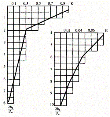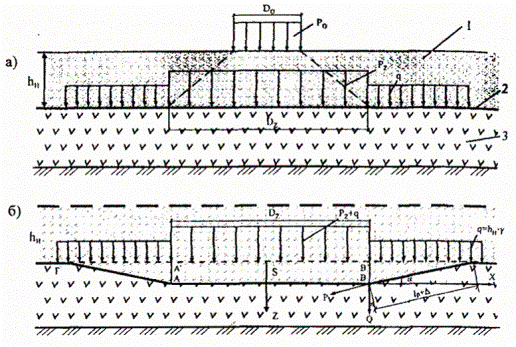 Примечание. Тип слабого грунта в данном случае соответствует типу болот согласно СНиП 2.05.02-85. Общий порядок расчета на колею выдавливания сводится к следующему: - задавшись hн в пределах Do ÷ 2Do, определяем величину к по графику (рис. 4.8); - используя зависимости (4.14, 4.15), определяем при допустимой величине S и по принятой величине hн значение Ргм; - вычисляем Pz по формуле 4.18; - проверяем условие (4.11) и в случае его неудовлетворения задаемся другим значением hн и повторяем расчет. Расчет на колею уплотнения по условию (4.16) осуществляется в такой последовательности: - задавшись hн в пределах Do ÷ 2Do, определяем величину «к» по графику (рис. 4.8); - задавшись допустимой осадкой Sдоп и используя зависимости (4.14, 4.15), определяем для принятой величины hн значение Ргм; - по формуле (4.18) определяем значение расчетных напряжений Pz; - по формуле (4.17) определяем расчетную осадку Sрасч и проверяем условие (4.16). В случае его неудовлетворения, задаемся другим значением hн и повторяем расчет. Рис. 4.7. Исходная (а) и приведенная (б) расчетные схемы: 1 - песчаная насыпь; 2 - геотекстильная прослойка; 3 - основание из слабого грунта Рис. 4.8. Зависимость