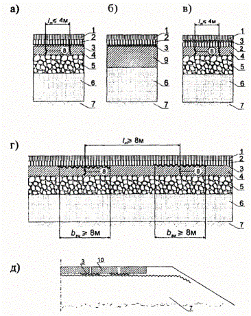 где δ - толщина геотекстильного материала; Кфг и Кфп - коэффициенты фильтрации соответственно геотекстильного материала (с учетом нагрузки от веса насыпи) и песка. 4.3.12. Толщина рабочей платформы может быть снижена в 1,5 раза при укладке полотна ГМ сплошным слоем на всю ширину подошвы насыпи. Обсадную трубу в этом случае погружают через геосинтетический материал. Процесс погружения дрен состоит из следующих операций: - заправки дрен в обсадную трубу; - погружения и извлечения обсадной трубы, обрезки дрены; - переезда на новую точку, смены катушки с дреной; - стыковка дрен с разных катушек. 4.3.13. Заправку дрены в обсадную трубу выполняют один раз для всего участка с помощью проволоки, продеваемой в трубу. Дрену зацепляют за конец проволоки и протягивают сквозь трубу. Конец дрены оборачивают вокруг якоря и вновь заправляют в трубу. 4.3.14. Погружение обсадной трубы ведется равномерно. Подъемы, даже кратковременные, не допустимы. По достижении заданной отметки начинают извлечение трубы из грунта, контролируя визуально сматывание дрены с катушки. После полного выхода трубу поднимают над уровнем земли на 30 см, обрезают дрену ножницами, оставляя конец около 20 см. Выходящий из трубы отрезок дрены стопорят якорем, заправляют в трубу и перемещают на новую точку. После того, как дренажная лента на катушке кончилась, последнюю снимают и заменяют новой. Конец ленты соединяют с началом ленты на второй катушке. Соединение осуществляется внахлест сшивкой нитками, проволокой или скобками. 4.3.15. Ход работ по погружению дрен фиксируют в журнале производства работ с указанием места, глубины погружения, характеристики материала, шага дрен. 5. ПРИМЕНЕНИЕ ГЕОСИНТЕТИЧЕСКИХ МАТЕРИАЛОВ ПРИ УСТРОЙСТВЕ И РЕМОНТЕ ДОРОЖНЫХ ОДЕЖД, УКРЕПЛЕНИИ ОБОЧИН5.1. Общие конструктивные решения5.1.1. В зависимости от конкретных условий и ставящихся целей дополнительные слои (прослойки) из ГМ устраивают на поверхности земляного полотна под дополнительным слоем основания, под нижним слоем несущего основания дорожной одежды, в верхних слоях основания или в слоях покрытия из различных видов асфальтобетонов, под слоем основания (покрытия) из сборных железобетонных плит, на обочинах. ГМ выполняют в этих случаях одну или несколько функций (армирование, защита, дренирование, гидроизоляция). В зависимости от выполняемых функций к показателям свойств ГМ предъявляются требования по п.п. 3.2, 3.3 и дополнительные требования по п.п. 5.1.2 - 5.1.5. Основные конструктивные решения представлены на рис. 5.1 - 5.4. 5.1.2. Защитно-дренирующие слои (прослойки) из ГМ на контакте между дополнительным слоем основания из песка и грунтом земляного полотна устраивают по всей ширине земляного полотна при строительстве (рис. 5.1а) или в зоне уширения при реконструкции (рис. 5.2а). Для создания прослоек применяют, как правило, нетканые геотекстильные иглопробивные материалы толщиной не менее 3,5 мм. В отдельных случаях, когда технически затруднены иные решения (например, при невозможности обеспечения требований СНиП 2.05.02-85 по возвышению поверхности покрытия над уровнем грунтовых или поверхностных вод в процессе реконструкции, при большом притоке воды q в дренирующий слой - q > 0,007 м/сут на 1 м2 площади), допустимо применение геокомпозитов из двух слоев фильтров с высокопористым полимерным заполнителем между ними. Такое инди