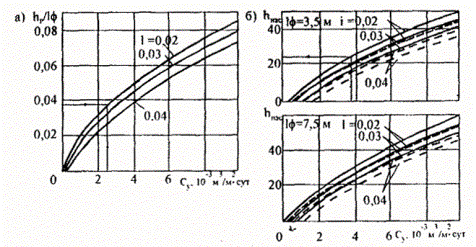 Rp - прочность ГМ при растяжении, Н/см; Кр = К / m, где m = 1,2 (вводится при укладке ГМ на контакте крупнофракционный материал - грунт), К - коэффициент снижения прочности ГМ в процессе эксплуатации, принимаемый по опытным данным или при их отсутствии по зависимости (3.1). При оценке прочности на строительные нагрузки принимают К = 1,0. 5.2.3. Уточнение предварительно принятого конструктивного решения выполняют: - в части применяемой марки ГМ - по результатам оценки (проверки) прочности ГМ; при несоблюдении условия 5.1 необходимо использовать ГМ большей прочности или из иного сырья; - в части конструкции и толщин слоев дорожной одежды: для защитно-дренирующих прослоек по п.п. 5.2.4 - 5.2.5; для защитно-армирующих прослоек по п.п. 5.2.6 - 5.2.8; для трещинопрерывающих прослоек по п. 5.2.9; для армирующих прослоек в слоях асфальтобетона по п. 5.2.10. 5.2.4. При применении общего конструктивного решения по п. 5.1.2 (защитно-дренирующие прослойки из нетканых иглопробивных материалов) расчет дренирующего слоя, исходя из варианта его работы на поглощение, выполняют по п. 5.13 ОДН 218.046-01, исходя из варианта его работы на осушение, - в соответствии с настоящими Рекомендациями в следующем порядке: - определяют в соответствии с п. 5.12 ОДН 218.046-01 расчетную величину притока воды в дренирующий слой qр, принимая при этом значение коэффициента гидрологического запаса Кг = 1; - определяют по номограмме рис. 5.5а, б расчетную глубину фильтрационного потока hp в зависимости от величины qр, длины пути фильтрации lф, поперечного уклона земляного полотна i, коэффициента фильтрации песка дренирующего слоя Кфп и расчетного значения коэффициента фильтрации ГМ Крфг; - определяют по номограмме рис. 5.6а степень увлажнения Су в зависимости от значений i и hр / lф; - определяют толщину слоя, полностью насыщенного водой, hнас по номограмме рис. 5.6б и вычисляют толщину песчаного дренирующего слоя hд для случая устройства под ним защитно-дренирующей прослойки из ГМ hд = hнас + hзап, (5.2) где hзап - 0,18 м для мелких песков, 0,14 м для песков средней крупности, 0,10 м для крупных песков. За расчетное значение коэффициента фильтрации ГМ Крфг принимают коэффициент фильтрации в плоскости полотна ГМ с учетом его снижения в период эксплуатации. Порядок определения Крфг следующий: - по номограмме рис. 5.7 определяют величину вертикальных нормальных напряжений σn от расчетной транспортной нагрузки на уровне земляного полотна; - по табл. п. 4.4 приложения 4 в зависимости от σn и i оценивают значение коэффициента фильтрации ГМ на начало периода стабилизации заиления Ксфг; - по табл. п. 4.7 приложения 4 принимают значение времени работы дренажа в расчетный период tг; - вычисляют общее число приложений транспортной нагрузки Nобщ за требуемый период эксплуатации Т, годы Nобщ = Nр tг T, (5.3) где Nр - величина приведенной интенсивности по п. 3.22 ОДН 218.046-01; - по табл. п. 4.5 приложения 4 определяют число нагружений на момент стабилизации заиления Nc; - вычисляют значение Крфг; Крфг = Ксфг е-b(Nобщ - Nс), (5.4) где b - коэффициент, учитывающий интенсивность протекания процесса заиления в период его стабилизации (рис. 5.8). Значение е-b(Nобщ - Nс) может быть найдено по табл. п. 4.6 приложения 4. Значение Крфг должно быть не менее 20 м/сут. Если данное условие не соблюдается, следует применять ГМ с большей водопроницаемостью или предусмотреть устройство под ГМ технологического песчаного 