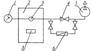 1 - микроманометр; 2 - камин; 3 - манжета резиновая; 4 - кран проходной; 5 - вакуум-насос; 6 - расходомер
