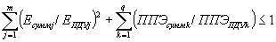 Еi - напряженность электрического поля, создаваемая источником ЭМП под i-тым номером; ППЭi - плотность потока энергии, создаваемая источником ЭМП под i-тым номером; Епду - ПДУ напряженности электрического поля нормируемого диапазона; ППЭпду - ПДУ плотности потока энергии нормируемого диапазона; n - количество источников ЭМП. При одновременном облучении от нескольких источников ЭМП, для которых установлены разные ПДУ, должны соблюдаться следующие условия: