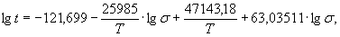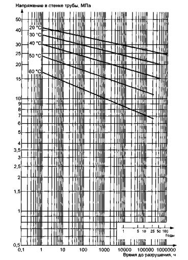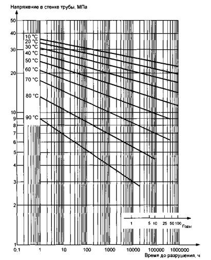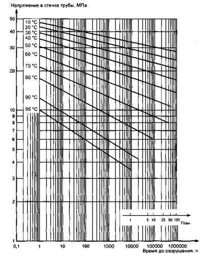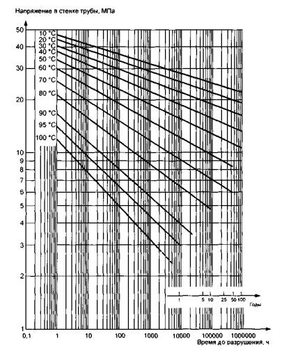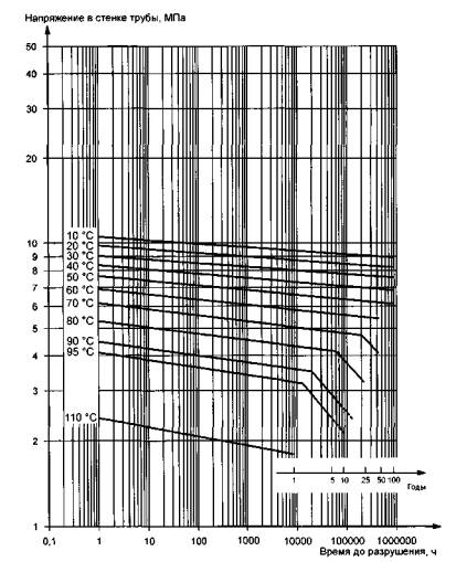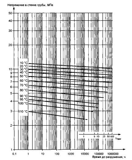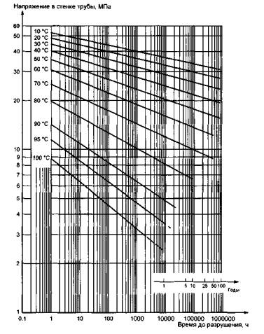 Левая часть ломаной: lg(t) = - 190,481 - (58219,035/T) • lg(σ) + 78763,07/T + 119,877 - lg(σ). Правая часть ломаной: lg(t) = - 23,7954 - (1723,318/7) • lg(σ) + 11150,56/T, где t - время, ч; Т - температура, K; σ - напряжение в стенке трубы, МПа Рисунок В.14 - Эталонные кривые длительной прочности РЕ-RТ Тип I
