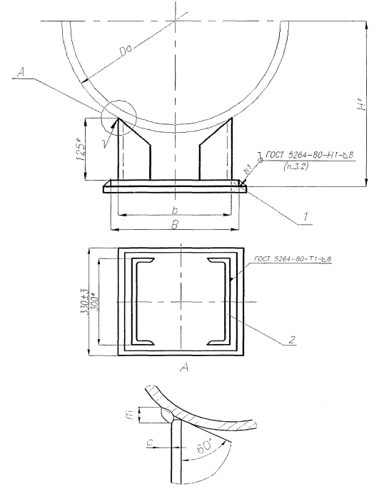 Дата введения 2002-01-01 1 Область примененияНастоящий стандарт распространяется на опоры неподвижные и скользящие приварные трубопроводов ТЭС и АЭС из углеродистых электросварных труб наружным диаметром от 530 до 1620 мм с температурой среды t ≤ 300 °С. Стандарт устанавливает конструкцию и размеры корпусов неподвижных и скользящих приварных опор. 2 Нормативные ссылкиВ настоящем стандарте использованы ссылки на следующие стандарты: ГОСТ 535-88 Прокат сортовой и фасонный из стали углеродистой обыкновенного качества. Общие технические условия ГОСТ 5264-80 Ручная дуговая сварка. Соединения сварные. Основные типы, конструктивные элементы и размеры ГОСТ 8240-97 Швеллеры стальные горячекатаные. Сортамент. ГОСТ 14637-89 Прокат толстолистовой из углеродистой стали обыкновенного качества. Технические условия ОСТ 24.125.170-01 Детали и сборочные единицы опор, подвесок, стяжек для линзовых компенсаторов и приводов дистанционного управления арматурой трубопроводов ТЭС и АЭС. Общие технические условия РД 153-34.1-003-01 Сварка, термообработка и контроль трубных систем котлов и трубопроводов при монтаже и ремонте энергетического оборудования (РТМ-1с) 3 Конструкция и размеры3.1 Конструкция и основные размеры опор должны соответствовать указанным на рисунке 1 и в таблице 2. 3.2. При использовании приварных опор в качестве неподвижных основание опоры приваривается по контуру к металлоконструкциям швом № 1 по РД 153-34.1-003-01. Шов может выполняться прерывистым симметричным относительно осей плиты. Минимально допустимая общая длина шва дана в таблице 1. При исполнении опоры в качестве скользящей шов № 1 не выполняется. 3.3 Маркировка и остальные технические требования по ОСТ 24.125.170. 3.4 Пример условного обозначения корпуса неподвижной приварной опоры исполнения 05: КОРПУС 05 ОСТ 24.125.153