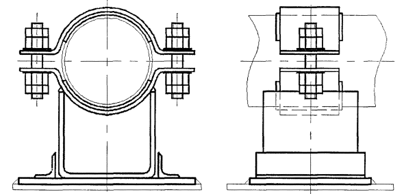 Дата введения 2002-01-01 1 Область примененияНастоящий стандарт распространяется на опоры скользящие направляющие хомутовые трубопроводов ТЭС и АЭС: - из хромомолибденованадиевых сталей наружным диаметром от 57 до 920 мм с температурой среды t ≤ 560 °С; - из углеродистой и кремнемарганцовистых сталей наружным диаметром от 57 до 820 мм с температурой среды t ≤ 440 °С; - из сталей аустенитного класса наружным диаметром от 57 до 325 мм с температурой среды t ≤ 440 °С. 2 Нормативные ссылкиВ настоящем стандарте использованы ссылки на следующие стандарты: ГОСТ 5264-80 Ручная дуговая сварка. Соединения сварные. Основные типы, конструктивные элементы и размеры ОСТ 24.125.154-01 Опоры скользящие трубопроводов ТЭС и АЭС. Конструкция и размеры ОСТ 24.125.157-01 Плиты направляющие опор трубопроводов ТЭС и АЭС. Конструкция и размеры ОСТ 24.125.170-01 Детали и сборочные единицы опор, подвесок, стяжек для линзовых компенсаторов и приводов дистанционного управления арматурой трубопроводов ТЭС и АЭС. Общие технические условия РД 153-34.1-003-01 Сварка, термообработка и контроль трубных систем котлов и трубопроводов при монтаже и ремонте энергетического оборудования (РТМ-1с) 3 Конструкция и размеры3.1 Конструкция и основные размеры опор должны соответствовать указанным на рисунках 1 - 5 и в таблицах 1 - 3. Допускаемые усилия на опоры приведены в таблице 4. 3.2 Основание опоры приваривается к строительным конструкциям по РД 153-34.1-003-01 непрерывным швом согласно рисунку 1, либо прерывистым симметричным относительно основания опоры. Минимально допустимая общая длина шва l дана в таблице 1. 3.3 Маркировка и остальные технические требования по ОСТ 24.125.170. 3.4 Пример условного обозначения скользящей направляющей опоры исполнения 05: ОПОРА 05 ОСТ 24.125.156