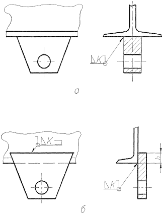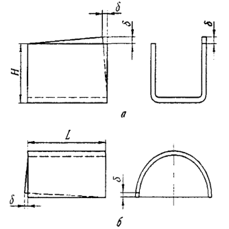 5.2.3 К сварке допускаются детали, принятые отделом технического контроля предприятия-изготовителя. 5.2.4 Сварка и прихватка под сварку должны производиться квалифицированными сварщиками, имеющими удостоверение, устанавливающее их квалификацию и характер работ, к которым они допущены. 5.2.5 По внешнему виду швы сварных соединений должны удовлетворять следующим требованиям: - иметь гладкую (для автоматической сварки) или равномерно чешуйчатую поверхность (с высотой чешуек не более 1 мм) без наплывов, прожогов, сужений и перерывов и не иметь резкого перехода к основному металлу; - не допускаются трещины и подтеки, а также ноздреватость и пористость на наружной поверхности швов. 5.2.6 Дефектные участки сварных швов должны быть удалены и затем заварены. Исправление дефектов сварки подчеканкой не допускается. 5.2.7 Подрезы основного металла допускаются глубиной не более 0,5 мм при толщине стали от 2 до 10 мм и не более 1 мм при толщине стали свыше 10 мм. 5.2.8 Внешний товарный вид сварных швов допускается оценивать методом сравнения с эталоном. 5.3 Требования к термической обработке5.3.1 Обязательной термической обработке подвергаются: - детали, изготовленные методом горячего формоизменения из хромомолибденованадиевой и хромомолибденовой сталей, если температура формоизменения была ниже 800 °С; - детали, изготовленные методом холодного формоизменения из хромомолибденованадиевой и хромомолибденовой сталей, при номинальной толщине или диаметре более 20 мм; - детали, изготовленные методом горячего формоизменения из углеродистых и низколегированных сталей, если температура окончания деформации была ниже 700 °С; 5.3.2 После сварки обязательной термической обработке (отпуску) подвергаются сварные соединения из хромомолибденованадиевых сталей, а также сварные соединения из хромомолибденовых сталей при номинальной толщине свариваемых элементов более 12 мм. 5.3.3 Вид и температурный режим термической обработки деталей и сборочных единиц устанавливается технологическим процессом, принятым на предприятии-изготовителе, в соответствии с рекомендациями специализированной научно-исследовательской организации. 5.3.4 Механические свойства основного металла и сварных соединений должны обеспечиваться технологическим процессом, принятым на предприятии-изготовителе, не ниже норм, установленных стандартами или техническими условиями на материалы. 5.4 Предельные отклонения размеров5.4.1 Предельные отклонения деталей и сборочных единиц устанавливаются настоящим стандартом, нормативной и конструкторской документацией с учетом требований к конструкции и способа изготовления, принятого на предприятии- изготовителе. 5.4.2 На деталях прямоугольной формы, изготовляемых из листовой или полосовой стали, отклонения от перпендикулярности короткой стороны относительно длинной не должно быть более 1 мм на 100 мм длины, но не свыше 5 мм. а - скоба; б - полукорпус Рисунок 1. Рисунок 2. Рисунок 3. Рисунок 4. 5.4.3 Отклонение от плоскости (винтообразность) d боковых поверхностей скобы опоры и полукорпуса пружинного блока не должно превышать 1 мм на 100 мм высоты Н или длины L (рисунок 1). 5.4.4 Отклонение d от номинального значения радиуса rном в корпусах опор (рисунок 2), полухомутах (рисунок 3), лапах (рисунок 4), секторах и полукольцах в любом месте не должно превышать: 2 мм при диаметре трубо