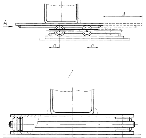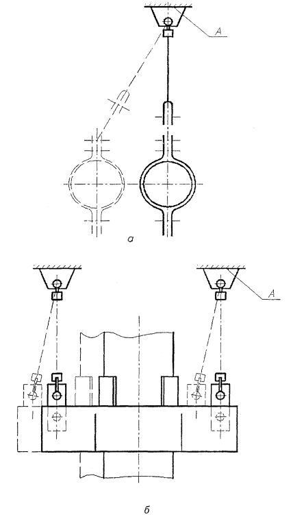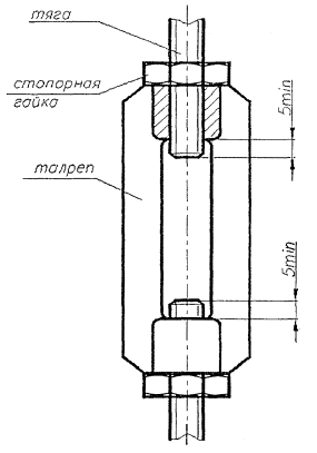 Рисунок 12. 11.5 При приварке проушин к металлоконструкциям рекомендуется ориентировать верхнюю образующую проушины А вдоль максимального перемещения трубопровода в горизонтальной плоскости (рисунок 13). Рисунок 13. 11.6 При монтаже подвесок рекомендуется фиксировать проушины и вилки в цепи таким образом, чтобы они располагались в разных плоскостях, обеспечивая наибольшую свободу перемещения трубопровода (см. ОСТ 24.125.100, рисунки 1 - 15). 11.7 Вилки, соединительные муфты, талрепы стопорятся стопорными гайками. Соединительные муфты стопорятся с обеих сторон, талрепы - со стороны правой резьбы. Установка стопорных гаек должна обеспечивать невозможность самоотвертывания резьбовых соединений в подвеске во время работы и невозможность проворачивания резьбовых соединений при регулировке длины цепи или затяжке пружин талрепами. После окончания сборки подвесок и регулировки пружин стопорные гайки пружинных блоков могут использоваться как стопорные гайки талрепов и соединительных муфт. 11.8 Сборка муфты с тягами должна быть произведена таким образом, чтобы концы обеих тяг были видны из центрального отверстия. Общий вид муфты в сборе с тягами приведен на рисунке 14. Рисунок 14. 11.9 При сборке талрепа с тягами концы тяг должны быть ввёрнуты внутрь талрепа не менее чем на 5 мм. Талреп имеет с одной стороны правую, с другой - левую резьбу. Общий вид талрепа в сборе с тягами приведен на рисунке 15. Рисунок 15. 11.10 Установочное положение каткового блока в катковых опорах по ОСТ 24.125.159 и ОСТ 24.125.165 приведено на рисунках 16 и 17. Оно определяется с учетом температурного перемещения трубопровода D в месте установки опоры. Перемещение D не должно быть более 180 мм. При D ≤ 180 мм установочный размер а принимать по формуле
