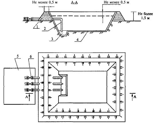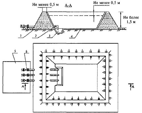 * Рекультивация земли в ликвидированных зимой амбарах осуществляется в летнее время по письменному согласованию с землевладельцем, но не позднее сроков, указанных в документах на землеотвод. 2.19. Амбары могут быть заглубленными (рис. 2.1) и наземными (рис. 2.2). 2.20. Амбары для сбора нефти в заболоченных местах разрабатываются за пределами болота, на твердом грунте. 2.21. Амбары для сбора нефти в скальных грунтах разрабатываются после предварительного рыхления скального грунта механическим или буровзрывным способом. 2.22. До начала разработки амбара проводят геодезическую разбивку места размещения амбара, с учетом безопасных расстояний до сооружений и коммуникаций. Для создания амбара необходимо использовать рельеф местности (овраги, балки). Рис. 2.1. Схема заглубленного амбара: 1 - земляной вал; 2 - приемо-раздаточный трубопровод Ду 150-200 мм; 3 - приямок; 4 - герметизирующий слой; 5 - площадка для размещения подпорных насосов; 6 - задвижка Ду 150-200 мм Рис. 2.2. Схема наземного амбара: 1 - земляной вал; 2 - приемо-раздаточный трубопровод Ду 150-200 мм; 3 - приямок; 4 - герметизирующий слой; 5 - площадка для размещения подпорных насосов; 6 - задвижка Ду 150-200 мм Расстояние от амбара для нефти до ремонтного котлована должно быть не менее 100 м (при температуре воздуха ниже минус 10 °С допускается это расстояние уменьшить до 50 м). 2.24. По периметру амбара устраивается земляной вал из уплотненной глины. Высота земляного вала по периметру амбара не должна превышать 1,5 м, ширина вала по верху должна быть не менее 0,5 м, крутизна откосов должна быть не более 45°. В нижней части амбара необходимо устраивать приямок. Размеры и емкость амбара рассчитываются исходя из объема откачиваемой нефти, но на заполнение не выше 1 м от верха обвалования (стенки). Площадь амбара не должна превышать 1500 м2. Дно и стенки земляного амбара должны иметь гидроизоляцию. В качестве гидроизоляции применяется слой глины (толщиной не менее 0,2 м с уплотнением механизированным способом, катком, вручную) или нефтестойкие полимерные пленки. 2.25. Для приема и откачки нефти земляные амбары должны быть оборудованы приемо-раздаточными трубопроводами с Ду не меньше 150 мм, которые должны быть расположены в нижней части обвалования и иметь отвод для спуска в приямок котлована ниже его дна. 2.26. Амбары должны иметь по всему периметру ограждение и предупредительные аншлаги «Огнеопасно!», «Проход, проезд и въезд запрещен!». Запрещается нахождение техники, людей и ведение огневых работ на расстоянии менее 100 м от амбара. В зимнее время при температуре воздуха ниже минус 10 °С допускается это расстояние уменьшить до 50 м. При невозможности расположения амбара для приема и хранения нефти при освобождении трубопровода далее 100 м от места врезки, дорог, возможного движения техники, зеркало нефти, находящейся в амбаре с площадью 1000 м2 и более, должно быть покрыто специальным составом для предотвращения испарения. 2.27. После завершения ремонтных работ и откачки нефти из амбара, необходимо провести зачистку амбара от загрязненного грунта. Зачистка проводится бульдозером на глубину пропитки грунта нефтью. Загрязненный грунт необходимо вывезти для дальнейшей переработки и утилизации (регенерации) или для захоронения в специально отведенные места, согласованные с экологической инспектирующей организацией. Засыпка ремонтного ко