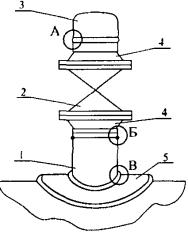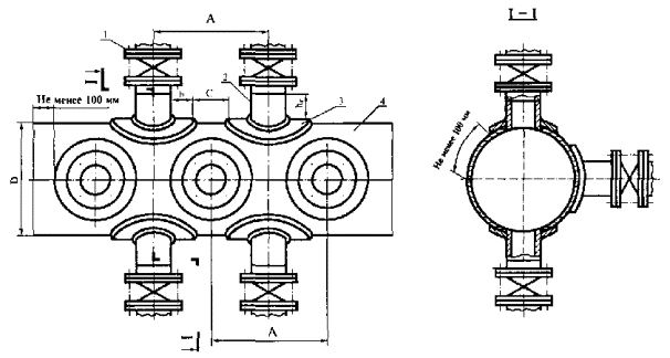Рис. 3.1. Схема расстановки вантузов при врезке для откачки нефти 1 - задвижка; 2 - патрубок; 3 - усиливающая накладка (воротник); 4 - ремонтируемый трубопровод; А - расстояние между вантузами; b - ширина усиливающего воротника; dв - диаметр вантуза (патрубка); D - диаметр трубопровода; hп - высота патрубка (определяется техническими параметрами применяемого для вырезки приспособления) - не менее 100 мм; с - минимальное расстояние между усиливающими воротниками