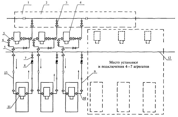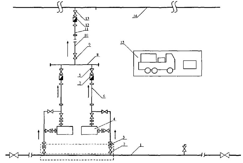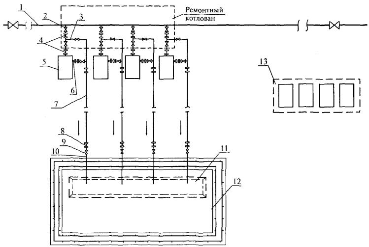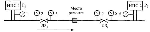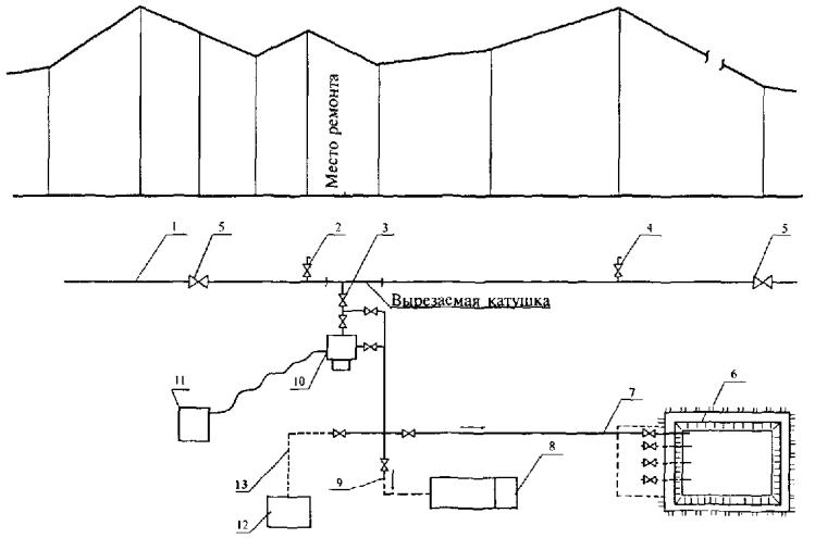 Рис. 6.2. Схема откачки нефти из ремонтируемого участка в параллельный МН: 1 - ремонтный котлован; 2 - вырезаемый дефектный участок; 3 - задвижка Ду 150 Ру 6,3 МПа; 4 - подпорный насос; 5 - гибкий металлорукав Ду 150, Ру 2,5-6,3 МПа; 6 - задвижка Ду 150, Ру 2,5 МПа; 7 - задвижка Ду 100-150, Ру 6,3 МПа; 8 - обратный клапан Ду 100-150, Ру 6,3 МПа; 9 - трубопровод Ду 100-150 Ру 6,3 МПа; 10 - рукав оплеточный Ду 100-150, Ру 6,3 МПа; 11 - основной насос; 12 - параллельный нефтепровод; 13 - ПМТ Ду 150, Ру 6,3 МПа