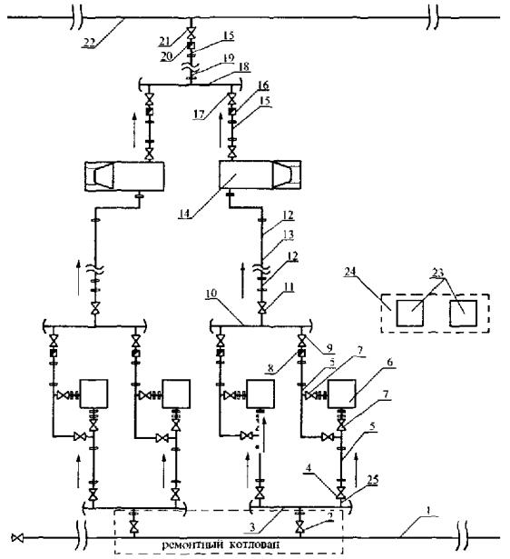 Рис. 6.3. Схема подключения 2-х основных и 4-х подпорных насосов для откачки из опорожняемого участка нефтепровода в параллельный нефтепровод: 1 - освобождаемый участок нефтепровода; 2 - задвижка Ду 150-200, Ру 6,3 МПа; 3 - коллектор Ду 250; 4 - задвижка Ду 150, Ру 2,5 МПа; 5 - гибкий металлорукав Ду 150, Ру 2,5-6,3 МПа; 6 - подпорный насос; 7 - задвижка Ду 150, Ру 2,5 МПа; 8 - обратный клапан Ду 150, Ру 1,6-2,5 МПа; 9 - задвижка Ду 150, Ру 1,6-2,5 МПа; 10 - коллектор Ду 250; 11 - задвижка Ду 150, Ру 2,5 МПа; 12 - металлорукав Ду 150, Ру - 2,5 МПа; 13 - ПМТ 150 Ду 4,0 МПа; 14 - основной насосный агрегат ПНУ; 15 - рукав оплеточный Ду 100-150, Ру 6,3 МПа; 16 - обратный клапан Ду 100-150, Ру 6,3 МПа; 17 - задвижка Ду 100-150, Ру 6,3 МПа; 18 - коллектор Ду 200-250 Ру 6,3 МПа; 19 - труба 100-150, Ру 6,3 МПа; 20 - обратный клапан Ду 150, Ру 6,3 МПа; 21 - задвижка Ду 150, Ру 6,3 МПа; 22 - параллельный нефтепровод; 23 - электростанции; 24 - площадка для установки электростанции; 25 - металлорукав Ду 150-200