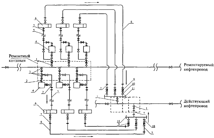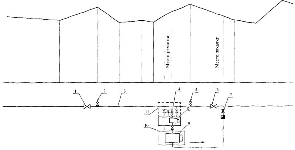 Рис. 6.4. Схема подключения насосных агрегатов для откачки нефти из опорожняемого участка в параллельный нефтепровод: 1 - Вантуз, Ду 150, Ру 6,3 МПа; 2 - металлорукав Ду 150, Ру 2,5 МПа; 3 - задвижка Ду 150, Ру 2,5 МПа; 4 - подпорный агрегат ЦНС 150-50; 5 - трубопровод ПМТ-150 Ру-6,3 МПа; 6 - основной насос ПН-150-50, 7 - рукав оплеточный Ду 100-150, Ру 6,3 МПа; 8 - трубопровод разборный Ду 100-150, Ру 6,3 МПа; 9 - обратный клапан Ду 100-150, Ру 6,3 МПа; 10 - задвижка Ду 100-150, Ру 6,3 МПа; 11 - коллектор Ду 250, Ру 6,3 МПа Рис. 6.5. Схема откачки нефти из ремонтируемого участка и закачки нефти через коллектор в параллельный МН: 1 - ремонтный котлован; 2 - вырезаемый дефектный участок; 3 - задвижка Ду 150 Ру 6,3 МПа; 4 - подпорный насос; 5 - гибкий металлорукав Ду 150, Ру 2,5-6,3 МПа; 6 - ПМТ-150 Ру - 6,3 МПа; 7 - основной насос; 8 - рукав оплеточный Ду 100-150, Ру 6,3 МПа; 9 - обратный клапан Ду 100-150, Ру 6,3 МПа; 10 - задвижка Ду 100-150, Ру 6,3 МПа; 11 - коллектор Ду 250, Ру 6,3 МПа; 12 - трубопровод Ду 200-250; Ру 6,3 МПа; 13 - обратный клапан Ду 150, Ру 6,3 МПа; 14 - задвижка Ду 150, Ру 6,3 МПа; 15 - параллельный нефтепровод Рис. 6.6. Схема откачки нефти из ремонтируемого участка за линейную задвижку: 1, 6 - линейные задвижки (закрыты); 2 - вантуз для подачи воздуха; 3 - ремонтируемый трубопровод; 4 - вантуз для откачки нефти; 5 - вантуз для подачи воздуха; 7 - трубопровод с задвижкой и обратным клапаном для закачки нефти; 8 - подпорный насос; 9 - насосный агрегат; 10 - площадка установки откачивающих агрегатов; 11 - ремонтный котлован Рис. 6.7. Схема откачки нефти из ремонтируемого участка за перевальную точку: 1 - линейная задвижка (закрыта); 2 - вантуз для подачи воздуха; 3 - ремонтируемый трубопровод; 4 - вантуз для откачки нефти; 5 - вантуз для подачи воздуха; 6 - подпорный насос; 7 - вантуз и обратный клапан на линии закачки нефти; 8 - линейная задвижка (открыта); 9 - насосный агрегат ПНУ; 10 - электростанция; 11 - площадка установки подпорных агрегатов; 12 - ремонтный котлован Рис. 6.8. Схема откачки нефти из ремонтируемого участка нефтепровода в амбар, резинотканевый резервуар или передвижную емкость: 1 - ремонтируемый трубопровод; 2, 4 - существующий или врезаемый вантуз для подачи воздуха; 3 - вантуз для откачки нефти; 5 - линейные задвижки (закрыты); 6 - амбар для нефти; 7 - трубопровод для откачки нефти в амбар; 8 - автоцистерна; 9 - трубопровод для откачки нефти в передвижную емкость (автоцистерну); 10 - подпорный агрегат; 11 - электростанция; 12 - резинотканевый резервуар; 13 - трубопровод для откачки нефти в резинотканевый резервуар