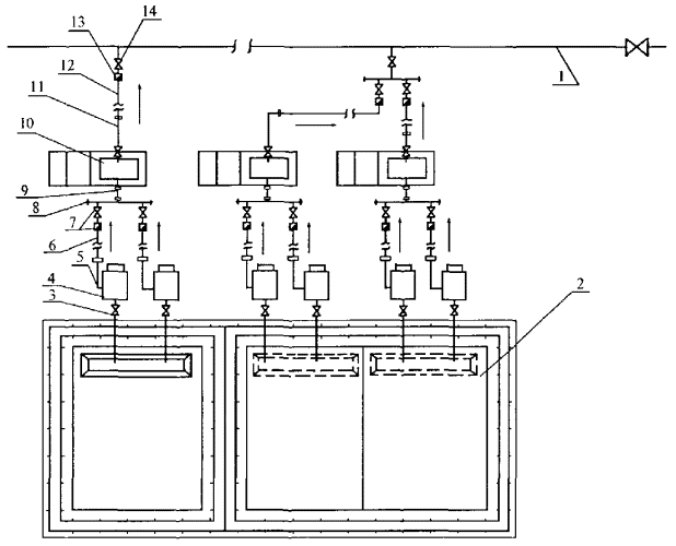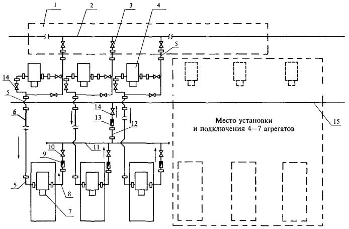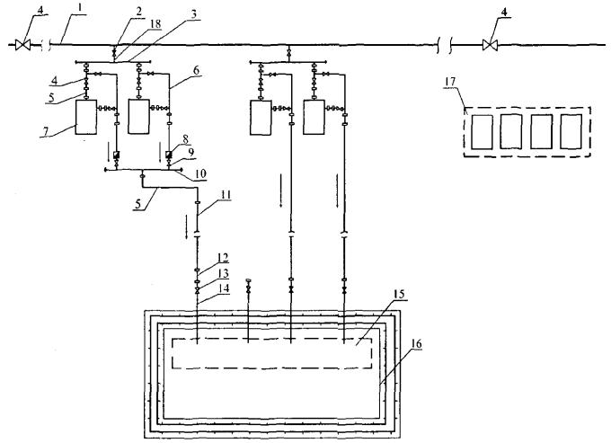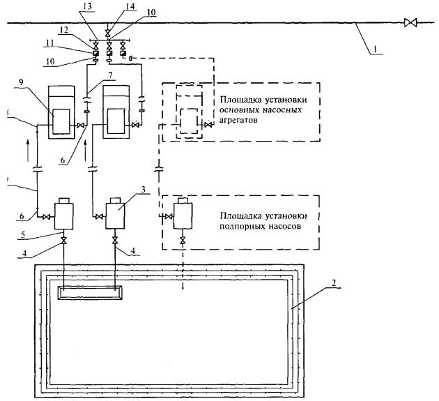 Рис. 6.9. Схема откачки нефти из ремонтируемого нефтепровода в амбар: 1 - освобождаемый от нефти участок нефтепровода; 2 - задвижка Ду 150, Ру 6,3 МПа; 3 - узел соединения с задвижками Ду 150, Ру 2,5 МПа; 4 - гибкий металлорукав Ду 150, Ру 2,5-6,3 МПа; 5 - подпорные насосы ЦНС 150-50; 6 - переходник 100-150 с узлом соединения; 7 - трубы ПМТ Ду 150 Ру - 6,3 МПа; 8 - металлорукав Ду 150, Ру 2,5 МПа; 9 - задвижка Ду-150, Ру-2,5 МПа; 10 - трубы Ду 150, полустационарные; 11 - приямок; 12 - амбар с нефтью; 13 - источники питания электродвигателей подпорных насосов Рис. 6.10. Схема откачки нефти из ремонтируемого участка двумя подпорными насосами в амбар: 1 - освобождаемый от нефти участок нефтепровода; 2 - задвижка Ду 200, Ру 6,3 МПа; 3 - коллектор Ду 250; 4 - линейные задвижки (закрыты); 5 - гибкий металлорукав Ду 150, Ру 2,5-6,3 МПа; 6 - узел соединения с задвижками Ду 150, Ру 2,5 МПа; 7 - подпорный насос ЦНС 150-50; 8 - обратный клапан Ду 150, Ру 2,5 МПа; 9 - задвижка Ду-150, Ру 2,5 МПа; 10 - коллектор Ду 250; 11 - трубы ПМТ Ду 150; 12 - гибкий металлорукав Ду 150, Ру 2,5 МПа с наконечником; 13 - задвижка Ду 150, Ру 2,5 МПа; 14 - полустационарная труба Ду 150; 15 - приямок; 16 - амбар с нефтью; 17 - электростанции; 18 - металлорукав Ду 200, Ру 2,5 МПа Рис. 6.11. Схема подключения агрегатов для откачки нефти из амбара и закачки ее в магистральный нефтепровод передвижными агрегатами: 1 - магистральный нефтепровод; 2 - амбар - хранилище нефти; 3 - подпорный агрегат; 4 - полустационарные линии приема нефти Ду 150 с задвижками Ру 2,5 МПа; 5 - гибкий металлорукав Ду 150, Ру 2,5-6,3 МПа с переходником; 6 - металлорукав Ду 150, Ру 6,3 МПа с переходником-наконечником ПМТ; 7 - трубопроводы ПМТ Ду 150 Ру - 6,3 МПа; 8 - металлорукав Ду 150, Ру 2,5 МПа с переходником; 9 - насосный агрегат; 10 - гибкий металлорукав Ду 150, Ру 6,3 МПа; 11 - обратный клапан Ду 100-150, Ру 6,3 МПа; 12 - задвижка Ду 100-150, Ру 6,3 МПа; 13 - коллектор высокого давления Ду 250, Ру 6,3 МПа; 14 - вантуз Ду 100-150, Ру 6,3 МПа Рис. 6.12. Схема откачки нефти из амбара параллельно включенными подпорными насосами на прием одного основного агрегата и закачка нефти в магистральный нефтепровод одним и двумя основными агрегатами (через один коллектор): 1 - магистральный нефтепровод; 2 - амбар - хранилище нефти; 3 - приемная линия нефти с задвижками Ду 150, Ру 2,5 МПа; 4 - подпорный насос НЦС 150-50; 5 - металлорукав Ду 150, Ру 2,5 МПа; 6 - трубопровод ПМТ Ду 150; 7 - обратный клапан и задвижка Ду 150, Ру 2,5 МПа; 8 - коллектор Ду 250, Ру 2,5 МПа; 9 - металлорукав Ду 150, Ру 2,5 МПа с наконечниками; 10 - передвижная насосная установка; 11 - рукав с металлооплеткой Ду 100-150, Ру 6,3 МПа с наконечником-переходником; 12 - трубопровод Ду 150, Ру 6,3 МПа; 13 - обратный клапан Ду 150, Ру 6,3 МПа; 14 - вантуз, узел подключения Ду 150, Ру 6,3 МПа к магистральному нефтепроводу Вантуз Ду-200 может устанавливаться с применением гребенки на два агрегата. Вантузы для всасывающей линии насосной установки, как правило, врезаются на заменяемый участок нефтепровода. К одному вантузу, предназначенному для закачки нефти Ду 150 может быть подключено не более 3-х насосных агрегатов. Расстояние между насосными агрегатами должно быть не менее 8 м. Схемы обвязки насосных агрегатов для откачки в параллельный нефтепровод приведены на рис. 6.1-6.5. 6.11. Перед началом работ по откачке подготавливаются площадки для установки основных, подпорных насосных установок, агрегатов и электростанций. Подпорный насос устанавливается в непосредственной близости к месту откачки нефти. Основной агрегат должен распол