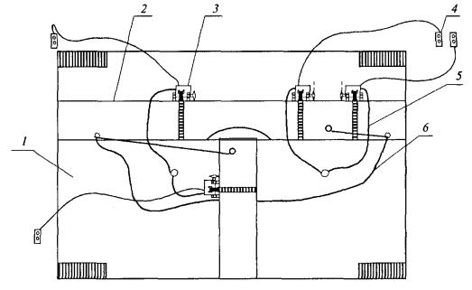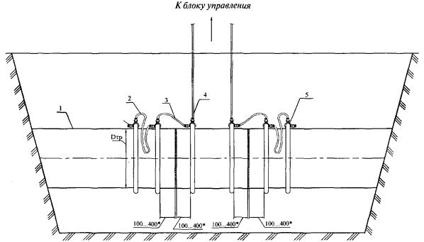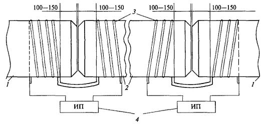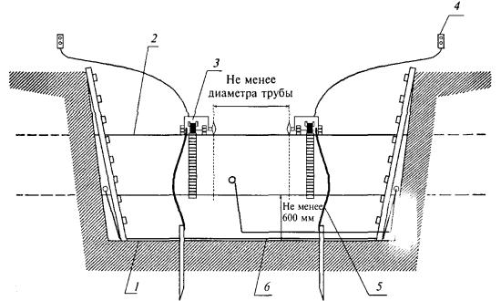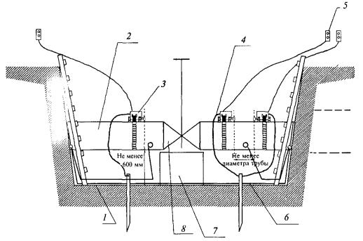 Рис. 7.2. Схема безогневой вырезки задвижки нефтепровода труборезами 1 - рабочий котлован; 2 - трубопровод; 3 - труборез; 4 - провода заземления труборезов со штырями; 5 - пульт управления трубореза; 6 - шунтирующая перемычка; 7 - фундамент задвижки; 8 - задвижка Рис. 7.3. Схема безогневой вырезки тройника труборезами 1 - рабочий котлован; 2 - трубопровод; 3 - труборез; 4 - пульт труборезом; 5 - провода заземления труборезов; 6 - шунтирующая перемычка 7.11. При вырезке тройника одновременно устанавливаются и работают три труборезных машины. 7.12. Работы при резке труб следует проводить с соблюдением следующих требований и в последовательности: - проверить и убедиться в полной исправности и комплектности применяемого оборудования до начала работ; - разметить место реза и установить труборез на трубопровод, при монтаже удерживать его грузоподъемным механизмом до тех пор, пока не будут натянуты цепи; - установить электрощит управления на расстоянии не менее 30 м от места проведения работ; - выполнить расключение силовых кабелей, заземлить труборез и пульт управления; - проверить силовые кабели на отсутствие внешних повреждений; - подготовить емкость с охлаждающей жидкостью вместимостью 50 л для обеспечения постоянного охлаждения фрезы во время резки; - застопорить вырезаемую «катушку» (арматуру) грузоподъемным механизмом; - произвести вырезку «катушки» в соответствии с инструкцией по эксплуатации трубореза, при движении трубореза по трубопроводу не допускать попадания силового и заземляющего кабелей, шунтирующих перемычек в зону работы фрезы, не допускать натяжки кабеля; - для избежания защемления режущего диска фрезы при резке труб, вследствие освобождающихся напряжений, необходимо вбивать клинья в надрез через каждые 250...300 мм на расстоянии 50...60 мм от режущего инструмента. Клинья должны быть изготовлены из искробезопасного материала. Грузоподъемные работы по монтажу и демонтажу труборезов, поддержке и удалению вырезаемых деталей выполнять с помощью грузоподъемных механизмов в соответствии с Правилами устройства и безопасной эксплуатации грузоподъемных кранов. 7.13. Работа по вырезке «катушек» безогневым методом отрезными машинками запрещается: - при отсутствии предохранительного кожуха на фрезе; - без равномерного постоянного охлаждения фрезы; - без заземления пульта управления, трубореза, передвижной электростанции; - при наличии людей в рабочем котловане, не занятых в работе по вырезке «катушки»; - при расстоянии между стенкой котлована и труборезом менее 0,5 м; - при скорости вращения фрезы более 60 об/мин. 7.14. После окончания работ по вырезке дефектного участка трубы, задвижки или соединительного элемента труборезные машинки демонтируются, ремонтный котлован освобождается от вырезанных «катушек», деталей и зачищается от замазученности. Вырезка дефектного участка с применением энергии взрыва 7.15. Вырезка дефектного участка с применением энергии взрыва должна проводиться в соответствии с Едиными правилами безопасности при взрывных работах, утвержденными Госгортехнадзором России, действующими инструкциями и положениями о порядке учета, хранения, использования и транспортирования взрывчатых материалов, по технологии, согласованной с Госгортехнадзором России. 7.16. Взрывные работы должны проводиться по проекту производства взрывных 