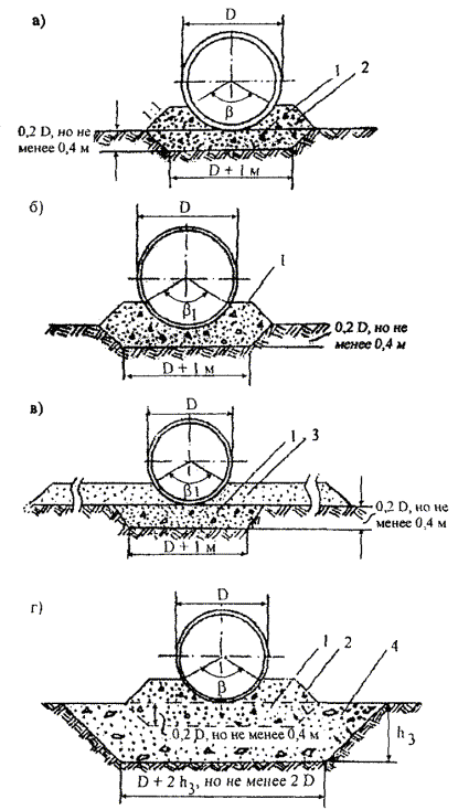 4.3.5. Конструкция основания металлических гофрированных труб должна отвечать принципиальным схемам, приведенным на рис. 2. Рис. 2. Конструкция основания под трубами: а - с устройством верхней части подушки после укладки трубы; б - с предварительным устройством ложа; в - с отсыпкой нулевого слоя и устройством ложа; г - с заменой грунта; 1 - первый этап отсыпки подушки; 2 - второй этап отсыпки подушки; 3 - нулевой слой; 4 - замена грунта основания скальной отсыпкой; b - 120° при опирании на плоское основание; b1 - 90° при опирании на грунтовое ложе Для устройства подушки под трубу следует применять пески средней крупности, крупные, гравелистые, щебенисто-галечниковые и дресвяно-гравийные грунты, не содержащие обломков размером более 50 мм. Перечисленные грунты не должны содержать более 10 % частиц размером менее 0,1 мм, в том числе более 2 % глинистых размером менее 0,005 мм. 4.3.6. Проектировать трубы следует, как правило, исходя из условия наименьшего нарушения естественного состояния мерзлых грунтов. Во всех случаях, когда это возможно, металлические гофрированные трубы должны укладываться в тело насыпи без устройства котлованов в мерзлых грунтах. Следует, как правило, избегать устройства приемных колодцев, глубоких бетонных, железобетонных и других экранов, различных врезок в мерзлые грунты. Трубы на косогорах при наличии вечномерзлых грунтов следует проектировать по индивидуальному расчету возможной деградации мерзлоты. 4.3.7. При необходимости замены слабого грунта в основании и целесообразности устройства мембраны из объемной георешетки глубина заменяемого грунта определяется расчетом. Замену следует производить дренирующим грунтом. Если крупность частиц дренирующего грунта удовлетворяет требованиям, то труба укладывается непосредственно на грунт замены. 4.3.8. Очертания и объем грунтовой обоймы вокруг труб, расположенных на вечномерзлых и пучинистых грунтах, устраиваются по действующим нормам. 4.3.9. Оголовки труб независимо от размера отверстия, как правило, следует применять бесфундаментных типов с выступающим из тела насыпи торцом трубы, срезанным вертикально или параллельно откосу насыпи. При необходимости увеличения водопропускной способности сооружения рекомендуется использовать трубы большего отверстия или многоочковые трубы. 4.3.10. Противофильтрационные экраны при всех грунтах основания следует применять из глинощебеночной или цементно-грунтовой смеси глубиной, равной толщине подушки. В качестве дополнительных мероприятий по повышению прочности и устойчивости основания трубы и прилегающих участков насыпи в районах с высокотемпературными вечномерзлыми грунтами рекомендуется устраивать: - на откосах насыпи каменную наброску толщиной 1 - 1,5 м на длине, равной высоте насыпи, но не менее четырех диаметров трубы в каждую сторону от оси трубы (для многоочковых труб - от оси крайнего очка) на высоту не менее 1 м над верхом трубы (либо до верха насыпи); - теплоизолирующие прослойки из пенопласта под концевыми участками труб; - комплексное применение каменной наброски. 4.3.11. Внутри трубы (по дуге до 120°) устраивается бетонный или асфальтобетонный лоток. Это конструктивное решение является дополнением к комплексу защитных мероприятий для предотвращения истирания защитного покрытия и основного металла. Толщина их достигает 5 - 6 см над