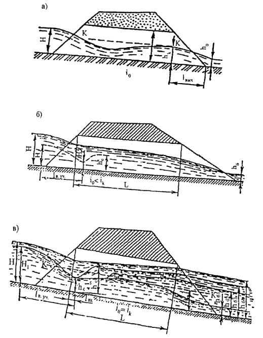 где hвх - глубина на входе в трубу; D - диаметр входного сечения, считая по впадинам гофра (наименьший диаметр). Когда сжатое сечение затоплено, пропускная способность трубы снижается. Затопление сжатого сечения может быть вызвано влиянием сопротивления по длине трубы при относительно большой ее длине и малом уклоне, повышенной шероховатостью или затоплением нижнего бьефа. Гофрированные металлические водопропускные трубы следует проектировать на пропуск расчетного расхода только при безнапорном режиме. При безнапорном режиме перед трубой и в пределах входной части трубы наблюдается кривая спада от подпертой глубины до сжатого сечения. Сжатое сечение в зависимости от типа водного оголовка, поперечного сечения и уклона находится на расстоянии (1,0 - 2,0)Н от входа в трубу, а глубина в сжатом сечении колеблется в пределах (0,4 - 0,7)Н. П.3.3. Определение пропускной способности труб «Длинные» и «короткие» трубы. Учет влияния нижнего бьефа П.3.3.1. В зависимости от влияния длины трубы на пропускную способность различают «короткие» и «длинные» трубы (рис. П.3.1). Трубы, на пропускную способность которых при безнапорном режиме оказывает влияние их длина, называют «длинными» в гидравлическом отношении. У «коротких» это влияние отсутствует, сжатое сечение не затоплено, поток сохраняет бурное состояние на протяжении всей трубы и пропускная способность зависит только от условия входного участка трубы. Общая длина «коротких» труб не оказывает влияния на пропускную способность трубы. В «длинных» трубах при наличии высокой шероховатости (гофров) сопротивление по длине влияет на пропускную способность. В «длинной» трубе энергии потока недостаточно для протекания в бурном состоянии, он переходит в спокойное состояние, и пропускная способность трубы уменьшается. Этот переход осуществляется гидравлическим прыжком, глубины потока в трубе при этом резко возрастают, сжатое сечение затапливается и может произойти смена безнапорного режима на полунапорный, частично напорный или напорный режимы, что очень опасно для нормальной работы трубы. П.3.3.2. «Короткими» считаются трубы, для которых соблюдается условие iT > iK. П.3.3.3. Критический уклон наиболее распространенных отверстий труб вычисляют по формуле iK»iK(граф) где iK(граф) и Dграф соответственно критический уклон и диаметр трубы (D = 1,5 или 2,0 м), [28] или см. уравнение критического состояния. n - фактический коэффициент шероховатости гофрированной трубы. Рис. П.3.1. Схема протекания воды в равнинной трубе при безнапорном режиме: а - «короткая»; б - «длинная»; в - «незатопленная» (hб2, hб3) и «затоплены» с нижнего бьефа (hб4) При iT < iK с некоторым приближением «короткими» можно считать трубы при соблюдении критерия относительной длины