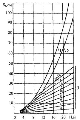 где ST - осадка основания при модуле деформации грунта Е = 100 кгс/см2 (см. рис. П.6.1). Исходными параметрами для расчета осадок должны быть: модуль деформации, объемная масса грунта и мощность геологических слоев в основании, высота насыпи. Осадка труб на многослойном основании рассчитывается путем суммирования осадок в пределах каждого слоя. Рис. П.6.1. Расчетный график для определения осадки трубы: ST - осадка основания при модуле деформации грунта 10 МПа; Н - высота насыпи; Z - расстояние от нижней границы слоя до верха основания; 1, 2 - при однородном основании и Расчетную осадку Sp под осью насыпи следует сравнить с предельно допустимой осадкой 8д, определяемой по формуле