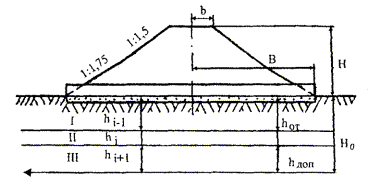 равный 0,75 (1+ аi - коэффициент сжимаемости i-го слоя оттаивающего грунта; γ - плотность грунта насыпи; hi - толщина i-го слоя оттаивающего грунта; Лсi - разность между суммарной льдистостью i-гo слоя грунта и суммарной влажностью образца грунта, взятого из этого слоя; п - число слоев, на которые разделяется при расчете толща оттаявшего (оттаивающего) грунта; Ai - коэффициент оттаивания i-го слоя грунта, характеризующий относительную осадку грунта при его оттаивании без нагрузки; р kлi - коэффициент, учитывающий неполное смыкание макропор при оттаивании мерзлого грунта, принимаемый в зависимости от средней толщины ледяных включений Dл: при Dл £ 1 см kл =0,7; при Dл ³ 3 см kл = 0,9; при промежуточных значениях Dл коэффициент kл определяется интерполяцией. Осадку Sп слоя грунта, предварительно оттаявшего на глубину hот рассчитывают по вышеприведенной формуле при значениях Аi = 0; Лсi = 0 и значениях ai определяемых с учетом ожидаемой степени уплотнения оттаявшего грунта. При этом формула имеет вид