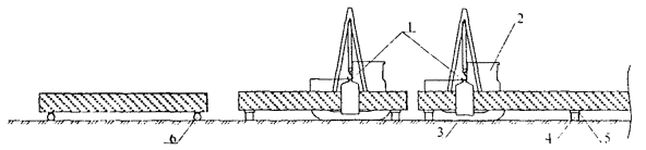 * Количество труб определено с учетом веса транспортного ложемента. 5. ЗАЩИТА ПОКРЫТИЯ ТРУБ ПРИ СВАРОЧНО-МОНТАЖНЫХ И ТРУБОГИБОЧНЫХ РАБОТАХПри сварке стыков дуговыми методами электросварки на трубосварочном стенде, а также на трассе применяют защитные коврики из огнестойкого материала, которые предназначены для предохранения заводского изоляционного покрытия от попадания на него брызг расплавленного металла. Ширина каждого коврика должна быть не менее 0,6 м, а длина равна периметру трубы. Защитные коврики размещают по обе стороны свариваемого стыка на расстоянии 10 - 12 см от него. Коврики пристегиваются и удерживаются на трубе эластичными кольцевыми хомутами или ремнями. Стрелы трубоукладчиков, используемых для сварочно-монтажных работ с изолированными трубами, должны быть также обрезинены. Применяемые лестницы необходимо облицевать мягкими подкладками. При подогреве кромок перед сваркой применяются внутренние подогреватели. Использование наружных подогревателей допускается при вварке катушек и монтаже захлестов. При этом следует предусматривать меры по предохранению изоляционного покрытия от воздействия открытого огня (применение защитных асбестовых ковриков, использование горелок с направленным действием пламени или электрических подогревателей). Для предотвращения повреждений изоляционного покрытия при применении электродуговых способов сварки накопители, покати, отсекатели, остановы, рольганги и роликовые опоры сварочной базы должны быть обрезинены или облицованы амортизирующими материалами. Комплект амортизирующего оборудования должен поступать централизованно по заявкам строительно-монтажных организаций. Сварку труб (секций труб) в плеть следует выполнять с использованием инвентарных монтажных опор (рис. 3). Конструкция таких опор должна обеспечивать устойчивое положение монтируемого трубопровода и отвечать требованиям правил техники безопасности. Рис. 3. Строповка трубы (секции) и удержание плети при монтаже: 1 - грузовой крюк трубоукладчика; 2 - трубоукладчик; 3 - мягкий строп; 4 - монтажная опора; 5 - мягкие подкладки; 6 - лежки с мягкими накладками. Раскладка труб (секций) по трассе производится на инвентарных лежках с мягкими накладками. Для подъема плети и трубы (секции) при сборке стыка применяются мягкие стропы (из капрона). При выполнении работ по гнутью труб следует руководствоваться требованиями ГОСТ 24950-81 «Отводы гнутые и вставки кривые на поворотах линейной части стальных магистральных трубопроводов». Перед началом гнутья необходимо подготовить трубогибочный станок к работе с изолированными трубами (секциями); - округлить края ложементов и башмака по всему периметру рабочих поверхностей (радиус закруглений должен быть не менее 25 мм); - при необходимости выполнить шабровку рабочих поверхностей станка с целью устранения задиров, выступов и т.п.; - установить вспомогательные обрезиненные катки для обеспечения продольных перемещений трубы без трения ее о ложемент. Гнутье труб на трубогибочном станке производится при температуре окружающего воздуха не ниже минус 20 °С. Обслуживание трубогибочного станка (перемещение труб и отводов, укладка труб на ложемент станка, поддержание при гибке, снятие отводов со станка) осуществляется краном-трубоукладчиком, оснащенным мягкими стропами. При с
