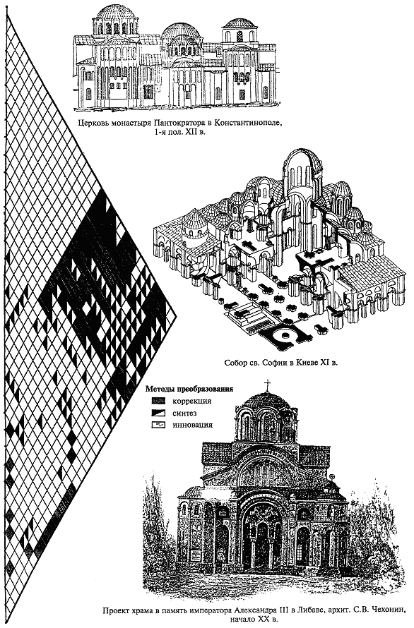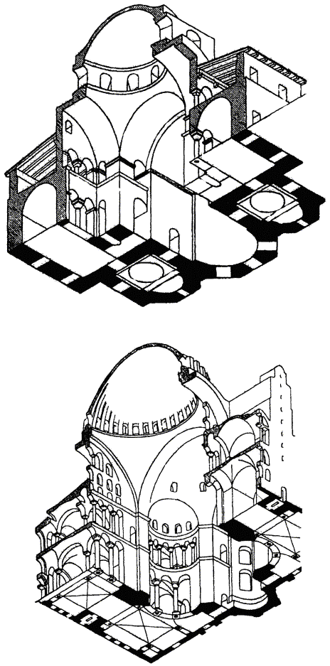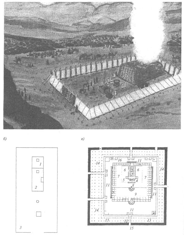 Рис. 6. Ветхозаветный храм а - модель Скинии; б - план Скинии; в - Иерусалимский храм времен Христа; 1 - Святая Святых; 2 - Святое; 3 - двор; 4 - жертвенник всесожжения; 5 - умывальница; 6 - двор священников; 7 - двор израильтян; 8 - ворота в двор израильтян; 9 - двор женщин; 10 - Никаноровские ворота; 11 - двор язычников; 12 - восточные ворота; 13 - притвор Соломонов; 14 - Царский портик; 15 - внешние стены; 16 - комнаты для различных целей Древняя Русь, приняв Крещение в 987 г., получила из Византии навыки храмостроительства, которые претерпели, однако, некоторые изменения, связанные как с местными условиями строительства, так и с особенностями русского восприятия христианской веры: «сочетание покаяния с надеждой на спасение» - по выражению митрополита Вениамина (Федченкова). Древнерусский крестово-купольный храм XII - XV вв., как правило, небольшой по размеру, прекрасных пропорций, небогато декорированный снаружи, но внутри сплошь покрытый дивными фресками, погружающими молящихся в созерцание небожителей. Для русской храмостроительной практики изначально была характерна работа «по образцу» с обращением к тем образцовым сооружениям храмов, которые были приняты церковным сознанием как канонические, т.е. соответствующие догматическому учению Церкви. Первые каменные церкви на Руси были возведены греческими мастерами и представляли собой типичные византийские крестово-купольные храмы. Основные характеристики архитектурной композиции византийских и древнерусских крестово-купольных храмов, представленные в табл. 3, следующие: осевая, симметричная, статичная композиция и гармоничная структура с иерархией соподчинения частей; двух(трех)-частная структура плана: алтарь - храм - (притвор); кубическая форма средней части храма с купольным покрытием центральной ячейки; прием контрастного перехода от небольшого, затемненного пространства притвора к высокому и светлому объему храма с кульминацией композиции в куполе; тектоничная система опирания барабана главы посредством «парусов» и арок на четыре столба в центре здания, откуда расходятся в стороны четыре сводчатые рукава; венчание храма одной или пятью главами полукруглого очертания; световая организация пространства храма с преобладанием освещения сверху; лаконизм, строгая простота внешнего оформления и богатство внутреннего убранства храма; соответствие наружных членений, декора внутренней структуре здания; округлые, арочные формы в интерьере и на фасадах; трехчастность в членениях стен и оконных проемов; декорация каменной кладки стен нишами, щелевидными окнами без мелкой пластики; вертикальная направленность членений фасадов. В дальнейшей истории русского храмостроительства эти характеристики типичного храма частично видоизменялись методами коррекции, синтеза с элементами, проникающими под влиянием западно-европейской архитектуры, или инновациями, диктуемыми новыми конструктивными решениями, строительными материалами или изменениями в церковном сознании в духе новейшего времени. Архитектура первых русских храмов, построенных византийцами, не имеет прямых аналогий с греческими храмами ввиду иных условий строительства и иных традиций, что определило своеобразный облик соборов, архитектура которых предопределила появление русской национальной традиции, получившей в дальнейшем блестя