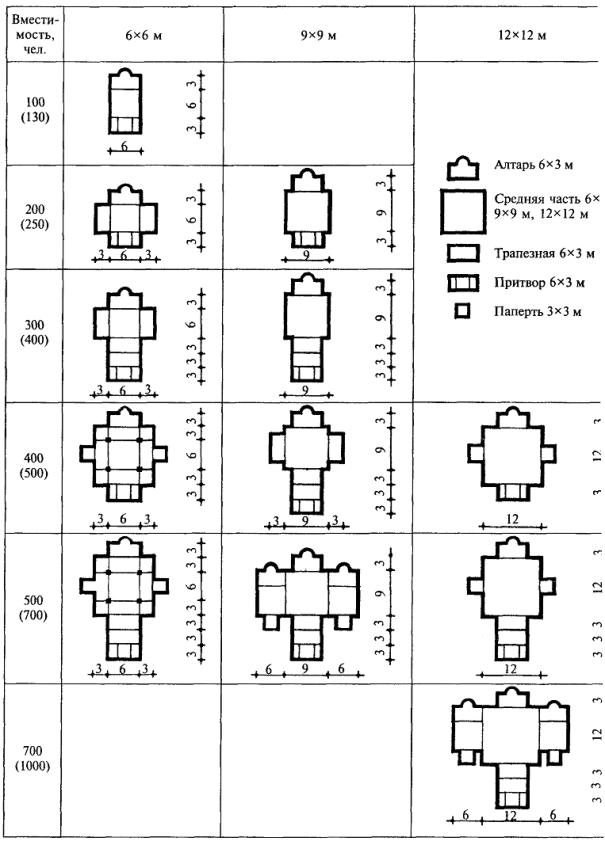 Рис. 8. Схемы построения объемной композиции храма (продолжение) Рис. 9. Объемно-планировочная типология храмов Рис. 10. Модульно-блочная компоновка храмов вместимостью от 100 до 700 чел. Форма плана традиционно бывает крестообразная, прямоугольная, круглая или восьмиугольная. Средняя часть может разделяться столпами на несколько нефов или, при их отсутствии, иметь зальную планировку. Размер центрального нефа предусматривается, как правило, большим, чем в боковых нефах. Традиционной формой кровельного покрытия русских православных храмов является купольная, позакомарная, шатровая, горкой кокошников, ярусная и щипцовая. Венчает храм глава луковичной, шлемовидной или иной формы с Крестом наверху. Традиционное количество глав на многоглавых храмах 3, 5, 7, 12, но может быть и иным. Как правило, количество глав бывает не меньшим, чем количество престолов в храме. Основные варианты объемно-планировочных решений отдельно стоящих храмов приведены в табл. 5. Таблица 5