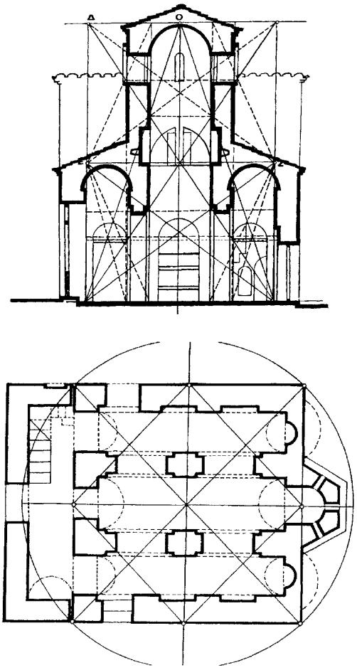сооружения пользовался двумя эталонами, связанными отношением Академик Б.А. Рыбаков показал, что в древнерусской системе мер длины существовали меры, несоизмеримые в рациональных отношениях, но соизмеряемые при помощи простых геометрических построений. Связь между ними определялась отношением квадрата и его диагонали («мерная сажень» и «великая косая сажень» - 249,4 см). Такое же отношение связывало «прямую сажень» - 152,8 см и «косую казенную сажень» - 216 см. В самих названиях - «косая сажень» - содержится указание на диагональ квадрата. Та же геометрическая закономерность связывает с прочими мерами и «сажень без чети». Совместное существование и использование этих единиц длины - вероятная основа практического способа установления соразмерности в произведениях зодчества Древней Руси. По мнению И.Ш. Шевелева, можно представить себе примерную схему разбивки плана храма. 1. На приготовленной выровненной площадке устанавливаются по странам света оси храма. Их перекрестие дает центр построения, который может быть использован для отсчетов размеров. 2. Специально изготовленными эталонами длины, в связь размеров которых заложена основная соразмерность постройки, размечается положение наружных стен храма, причем западная ветвь оси храма устанавливается более протяженной, чем восточная. Рис. 15. Схема построения планов крестово-купольных храмов а - варианты построения удлиненного центрального звена плана; б - геометрический анализ плана 2-го яруса Спасо-Преображенского собора в Переяславле-Залесском, 1152 г. аб : вг = де : жи = кл : мн = 1 : ( Рис. 16. Соразмерности храма Покрова на Нерли 3. Определяются прямоугольник, очерчивающий столбы, толщина столбов и подкупольный прямоугольник. Эта операция имеет решающее значение для композиции внутреннего пространства храма: она устанавливает ширину пересекающихся в центре и образующих форму креста главного нефа и трансепта, определяя их взаимосвязь и связь в ширине продольных нефов (главного с боковыми). Одновременно с этим чертеж ядра на земле определил связь диаметра купола с размерами храма в плане, взятыми по стенам четверика. Развитие внутреннего пространства в направлении север-юг определяется взаимосвязью размеров поперечных пространств. Чтобы достичь композиционного единства, мастер должен установить соответствие в ширине западной и восточной травей, прибавить к ним с востока глубину алтаря и с запада - ширину нартекса. Эти размеры обычно также подчинены размерам ядра храма. Но, кроме того, в сумме они ограничены положением уже намеченных наружных стен храма. Поэтому возможны некоторые неувязки между первоначально определенной длиной храма и длиной, полученной вследствие уточнения взаимодействия внутренних размеров. Современный архитектор определяет размеры каждого элемента своего произведения в зависимости от его назначения, материала и конструкции. Он выражает их величины в отвлеченных измерениях метрической системы мер и фиксирует на чертеже. Строители, возводя постройку, соизмеряют величины ее элементов с чертежом и условной единицей - метром, а не в отношениях одного к другому. Таким образом, соразмерность потеряла свое прежнее практическое значение. И если в прошлом несоразмерная постройка была невозможна технически, то теперь строительный процесс не контролирует гар