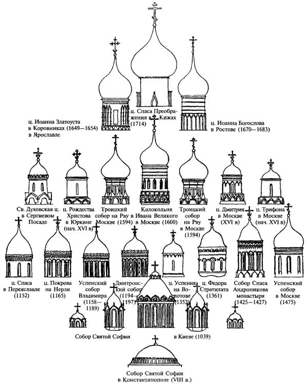 Для храмовой архитектуры Пскова типичными являются построенные по заказам горожан небольшие четырехстолпные церкви с одной главой на повышенных подпружных арках, которые со временем обрастали со всех сторон приделами, галереями, крыльцами, звонницами, создавая живописный, но гармонично уравновешенный ансамбль. Типичным декоративным убранством барабанов глав псковских храмов является скромная «каменная кайма» в виде чередующихся полос треугольных и прямоугольных впадин, увенчанных арочным пояском. В связи с применением западной манеры звона - раскачиванием колокола, а не его языка, широкое распространение в псковских храмах в XV - XVI вв. приобрели звонницы, имеющие вид стены с прорезанными в верхней части проемами для подвески колоколов. Небольшие по размеру храмы раннего периода московского княжества воплотили в своем облике лучшие черты предшествующего периода развития русской храмовой архитектуры: центричность и динамизм композиции, устремленность форм храма ввысь, а также чисто московские приемы в виде ряда кокошников у основания главы храма и горизонтальный пояс резного белокаменного орнамента вместо аркатурного фриза, как, например, в Успенском соборе на Городке в Звенигороде. Возросшее значение Москвы в середине XV в. и выдвижение идеи «Москва - третий Рим» определили необходимость строительства в Кремле нового общественно-религиозного центра, для чего московский князь Иоанн III приглашает в Москву лучших зодчих как из «первого Рима» - Италии, так и из псковско-новгородской земли. Болонский архитектор Фьораванти, взяв за образец владимирский Успенский собор при строительстве Успенского собора Кремля, существенно перерабатывает его крестово-купольную структуру в направлении большей цельности объема, характерной для рационалистического мышления эпохи Возрождения. Венецианский зодчий Алевиз Новый строит новый Архангельский собор в традициях русской архитектуры, однако с декоративным убранством фасадов в духе итальянского Ренессанса: раковинами и круглыми окнами в закомарах, капителями на лопатках, филенками и ярусными членениями на пряслах стен. К XVI в. русские зодчие, усвоив знания западной строительной техники, как раньше византийской, обратились к решению задачи создания своей самобытной храмовой архитектуры, в том числе с применением шатровых покрытий и богатством объемной композиции. Шатровые храмы являлись одной из распространенных, привычных и любимых форм в деревянном зодчестве. Высокий четырех- или восьмигранный сруб церкви увенчивался обычно высокой шатровой кровлей с одной главой наверху. Этот тип постепенно усложняется, к храму пристраиваются приделы, покрытые чаще всего так называемой «бочкой» или шатром меньшего размера. Иногда шатровый храм опоясывается крытой галереей внизу у подклета или на высоте второго этажа. Многие шатровые каменные храмы, возведенные в XVI в., посвящаются определенным событиям. Их объемно-планировочное решение зачастую подчинено мемориальной задаче, иногда в ущерб основному назначению храма - богослужебному. Таковы церковь Вознесения в Коломенском и Покровский собор на Красной площади. XVII в. знаменуется определенным обмирщением храмового зодчества. Оно выражается в стремлении к разукрашенности, обилии декоративных средств, характерных для гражданс