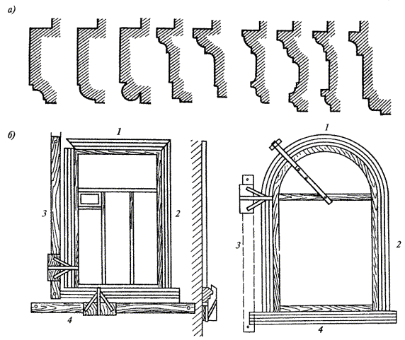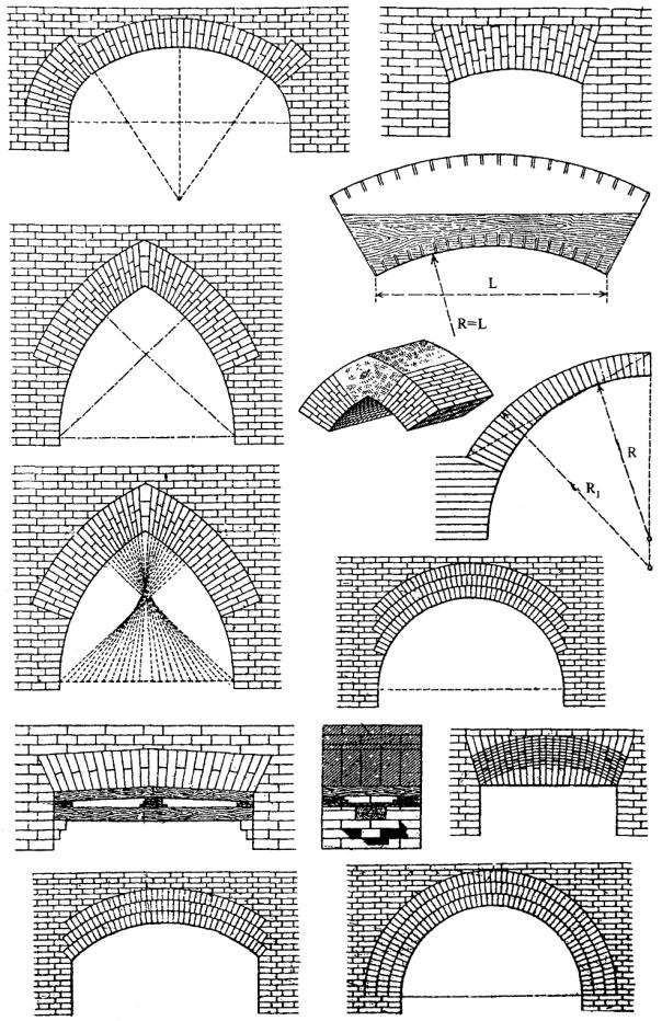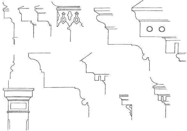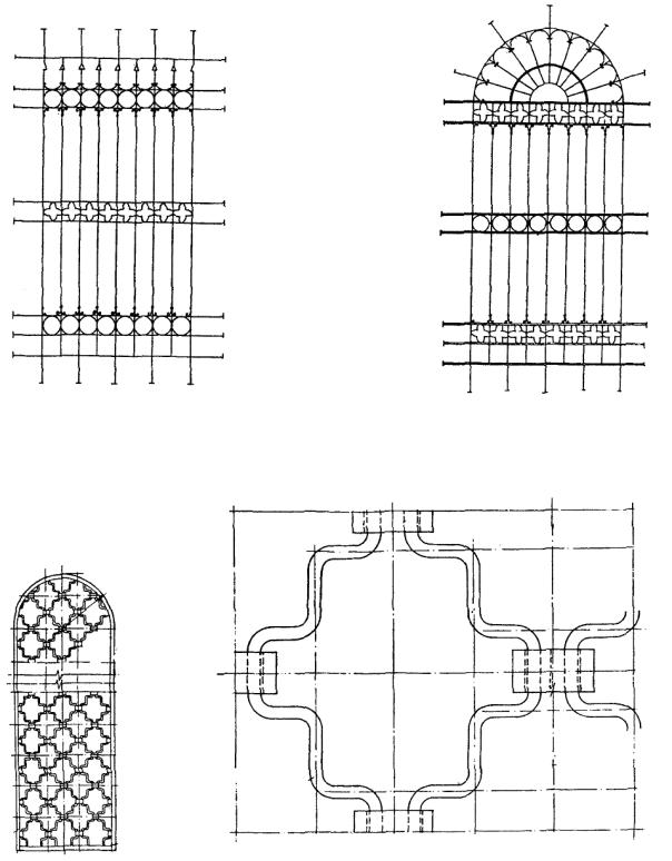 На окна храмов, как правило, устанавливаются решетки, часть из которых должна иметь возможность открывания наружу помещений в целях пожарной безопасности. В рисунках решеток часто используется крестообразный мотив. Примеры решеток приведены на рис. 21. Число окон в световом барабане главы должно быть четным и, как правило, принимается равным 4, 6, 8, 12, 16. Наружные поверхности Наружные поверхности кирпичных храмов могут быть украшены выступающими элементами фигурного кирпича, в том числе карнизами, обрамлениями окон и дверей, декоративными фризами, аркатурным поясом и т.д. Примеры декоративного убранства кирпичных храмов приведены на рис. 22, 23. Стены могут быть отделаны также известково-песчаной, известково-цементной штукатуркой, а также натуральным камнем. Использование цементно-песчаной штукатурки не позволяется ввиду ее паронепроницаемости. Штукатурными могут быть декоративные элементы стеновых поверхностей и карнизов (рис. 24). Штукатурные работы Виды штукатурок (простая, улучшенная и высококачественная) должны устанавливаться проектом. Высококачественная и улучшенная штукатурки должны выполняться путем нанесения слоя обрызга, одного или нескольких слоев грунта и накрывочного слоя, а простая штукатурка - путем нанесения слоя обрызга и одного слоя грунта. Штукатурка фасадов должна производиться сверху вниз захватками, начиная от венчающего карниза здания. До начала работ по оштукатуриванию фасадов должны быть установлены коробки дверей и окон, поставлены ухваты для водосточных труб, установлены крепления пожарных лестниц, закончено устройство козырьков, поясков, карнизов и т.п. Внутреннее оштукатуривание поверхностей храма надлежит выполнять из растворов на извести, позволяющих вести роспись различными красками. Выступающие кирпичные и деревянные архитектурные детали (карнизы, пояски и т.п.), места сопряжений деревянных частей зданий с каменными, кирпичными и бетонными конструкциями, а также другие поверхности в случае необходимости нанесения на них штукатурного намета общей толщиной более 20 мм должны до оштукатуривания покрываться металлической сеткой с размером ячеек 10 ´ 10 мм или плетением из проволоки с ячейками не крупнее 40 ´ 40 мм. Рис. 21. Оконные решетки Места сопряжения оштукатуриваемых конструкций, выполненных из разных материалов, обиваются металлической сеткой на 4 - 5 см по обе стороны стыка. Средняя общая толщина штукатурного намета не должна превышать для простой штукатурки 12 мм, улучшенной - 15 мм и высококачественной - 20 мм. Толщина слоя накрывки после ее выравнивания и затирки войлочными терками должна составлять не более 2 мм. Для наружных декоративных штукатурок толщина накрывки должна составлять 4 - 7 мм и наноситься по окрепшему, заранее нарезанному грунту. Для защиты оштукатуренной поверхности здания от атмосферных осадков ее обрабатывают гидрофобной жидкостью, которая состоит из 2 ч по массе метилсиликоната натрия и 98 ч. воды. В известковые или цементно-известковые растворы перед нанесением на фасад вводят гидрофобизирующие добавки. Для вытягивания свода в его центре устанавливают жесткую ось и на ней укрепляют шаблон-лекало таким образом, чтобы оно свободно держалось и вращалось, а между лекалом и стенками свода оставалось пространство, равное толщине штукатурки. Когда на своде распо