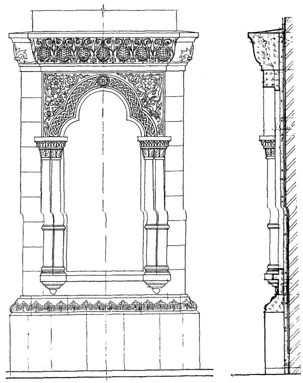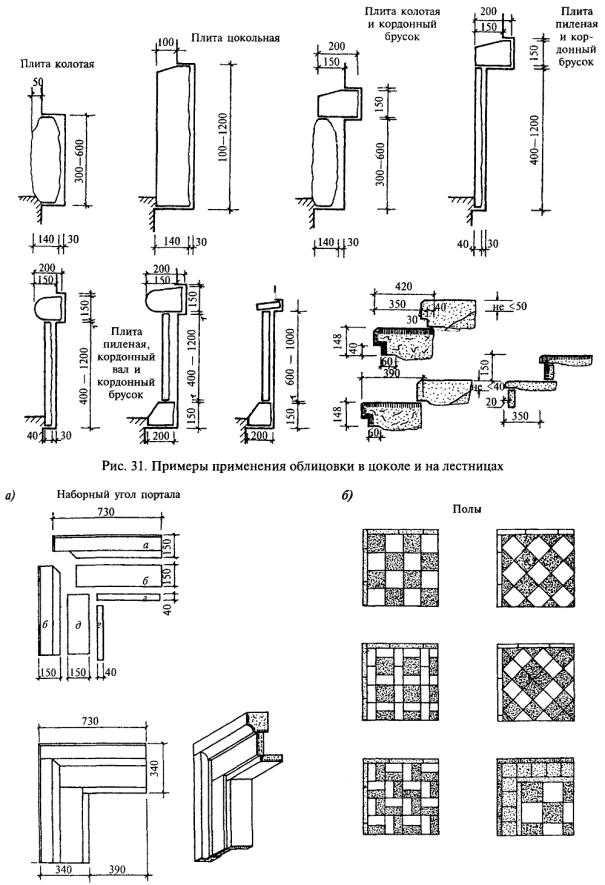 Рис. 29. Резные капители из альбома кн. Г. Гагарина К профильным элементам облицовки стен относятся цокольные плиты и кордонные камни, обрамления порталов, пояски, карнизы, подоконные плиты, плинтусы и т.п. (рис. 31, 32). Конструкция облицовки вертикальных поверхностей должна устранять возможность проникания влаги через стыки облицовочных деталей. Растворы, применяемые для облицовочных работ, не должны содержать растворимых солей, образующих высолы на поверхности облицовки. Стальные элементы конструкций, примыкающие к облицовке, а также стальные крепления, используемые для монтажа плит и деталей облицовки, должны быть защищены от коррозии. Наружные облицовочные работы должны производиться преимущественно одновременно с кладкой стен; при этом следует учитывать усадку раствора в швах кладки стен. Плиты и детали наружной облицовки, за исключением облицовки на относе, устанавливаются на растворе. Крепежные детали (скобы, пироны, крючья) должны быть оцинкованы или изготовлены из нержавеющей стали. Для крепления плит мраморной облицовки применяются детали латунные, медные (обмедненные) или из нержавеющей стали. Рис. 30. Белокаменный киот из храма Преображения Господня комплекса Храма Христа Спасителя в Москве (АХЦ «Арххрам») Барельефы и горельефы должны монтироваться одновременно с облицовкой стен. Облицовка мрамором панелей стен, а также балясника и косоуров лестниц должна производиться до облицовки пола и ступеней. Для облицовки фасадов применяются плиты и детали из гранитов, плотных известняков и песчаников, белых мраморов, туфов и др. В целях предотвращения коррозии облицовки и появления высолов необходимо соблюдать следующие требования: Рис. 32. Облицовка гранитом а - наборный угол; б - пол а) верхние грани всех выступающих гранитных деталей (карнизов, поясков, сандриков) должны иметь уклон наружу для стока воды и капельники; б) уширение верхней плоскости гранитных карнизов между пилястрами и гранитного цоколя необходимо перекрывать плитой; в) верхние плоскости карнизов, поясков и сандриков из известняка и песчаника должны иметь металлические покрытия; г) в местах, где облицовка из известняка устанавливается на гранитное основание, горизонтальные выступы гранита не допускаются. Внутренняя облицовка природным камнем Для облицовки поверхностей должны применяться плитные и профильные детали из мрамора и гипсового камня. Фактура облицовочных деталей должна быть зеркальной или лощеной, что определяется проектом. Облицовка стен должна выполняться до устройства покрытия пола. Облицовочные изделия из мрамора в целях сохранения их декоративных качеств устанавливаются с относом от стен без заливки раствором. Смежные плиты рисунчатых мраморов подбираются по цвету и рисунку. Плиты и детали сопрягаются насухо с толщиной шва между ними в 1 мм с точностью +0,5 мм. Швы заделываются гипсом, окрашенным в цвет камня. Заливка раствором зазора между облицовываемой конструкцией и плитами производится слоями в несколько приемов, во избежание смещения плит. Полы в храме рекомендуется выполнять из шлифованного природного камня, керамики или дерева, допускающих мокрую уборку. Предпочтение следует отдавать камню типа доломит, хорошо впитывающему влагу, имеющему нескользкую поверхность и теплую, что особенно важно при коленоприклонени
