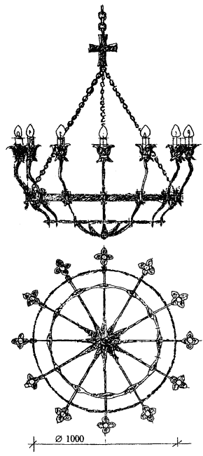 Рис. 38а. Бра на 3 лампы (архит. С. Кузнецов) Наиболее нагружены в конструкции перекрытия системы подпружные арки и паруса, несущие центральный световой барабан (рис. 45). Следует заметить, что функции арок и парусов при неизменной общей нагрузке могут существенно меняться в течение эксплуатации здания. В строительный период подпружные арки работают как перемычки, несущие полный вес барабана и парусов. По мере того, как твердеет раствор кладки, паруса, упираясь в опорное кольцо барабана, начинают работать самостоятельно, передавая свою часть нагрузки и распора на столбы и далее на элементы жесткости. Распределение нагрузки между арками и парусами зависит от пролета перекрываемого модуля, системы и качества кладки парусов, толщины арок, наличия воздушных связей. Иногда нагрузка на подпружную арку может быть назначена «по факту», как вес блока кладки барабана, ограниченного усадочными или иными трещинами. Паруса при небольших диаметрах барабанов имеют незначительный вылет. Нагрузка на паруса передается, таким образом, почти по всей площади, что допускает простую кладку парусов горизонтальными нависающими рядами. При достаточном сцеплении раствора паруса могут работать и как «кронштейны», и как распорные конструкции, воспринимающие усилие распора под углом к плоскости швов. С ростом пролетов функции таких ложных парусов, как консольных или распорных элементов, резко падают. Полутораметровый, например, ложный парус, соответствующий семиметровому пролету арок, теоретически уже не способен нести вес «своего» сектора барабана и тем более помогать подпружным аркам при их деформации. Ненадежность опирания барабана является одной из причин ограничения его диаметра и пролета подпружных арок. Рис. 40. Свечной ящик (архит. Л. Клешнина) Рис. 41. Византийские крестово-купольные храмы Рис. 42. Центральная ячейка крестово-купольного храма Рис. 43. Глава крестово-купольного храма Рис. 44. Распределение усилий в крестово-купольной системе (схема Г.Б. Бессонова) а - схема сосредоточенных распоров; б - рабочая схема плоской трехпролетной системы Рис. 45. Работа арок и парусов крестово-купольной системы (схема Г.Б. Бессонова) а - схема сбора нагрузок; б - нагрузки и реакции диагональной полуарки паруса; в - рабочая схема системы; г - устойчивое положение барабана при обрушенных арках; д - изменение уровня опорного кольца и стрелы паруса Воздушные связи арочных конструкций, будучи расположены в разных уровнях относительно пят, могут иметь неодинаковые функции и по-разному формировать внутренние усилия в сводах. Затяжки в уровне пят арок и сводов могут воспринимать: полный распор, если опорные конструкции способны нести лишь вертикальную нагрузку (стойки открытых павильонов и галерей, перекрытых цилиндрическими сводами на распалубках и подпружных арках или крестовыми сводами); «излишек распора», не воспринимаемый опорными конструкциями в силу их недостаточной устойчивости (крестово-купольные храмы при значительных пролетах сводов и умеренных толщинах несущих стен и столбов). Затяжки в уровне пят могут быть поставлены и конструктивно в сооружениях, где распор надежно гасится совместной работой вертикальных и горизонтальных элементов жесткости. При нормальной, спокойной статике большинства крестово-купольных сооружений роль воздушных связей в о