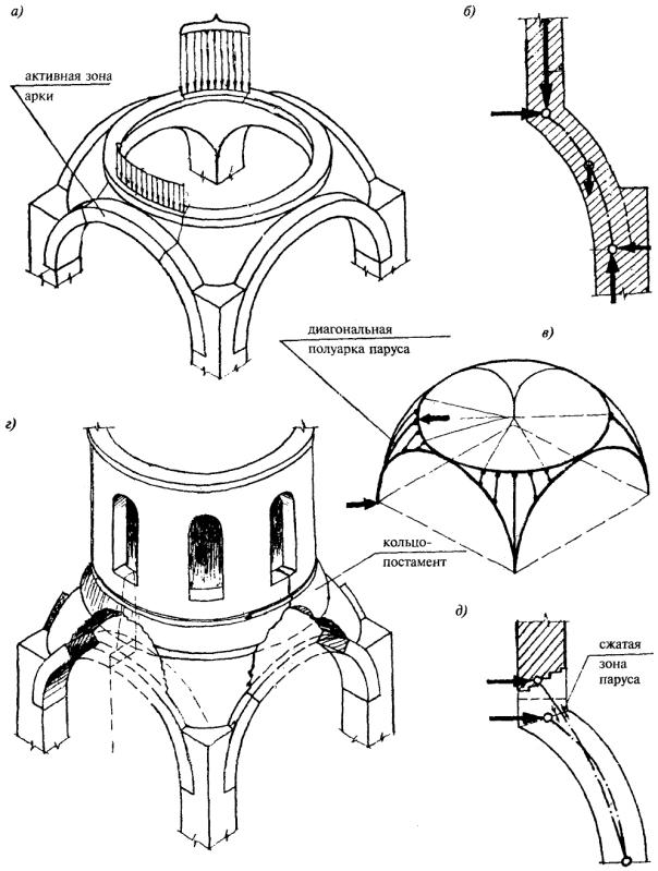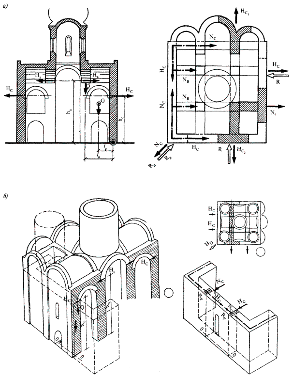 Рис. 37а. Семисвечник (архит. С. Кузнецов) Крестово-купольная система конструкцииКонструктивную основу крестово-купольных храмов составляет трех- или пятипролетная арочно-стоечная система. Подпружные арки, опирающиеся на наружные стены и центральные столбы, служат основанием для цилиндрических сводов, составляющих крест, и угловых ячеек. На центральные подпружные арки опирается центральный световой барабан (рис. 42, 43). Арки делят в плане сводчатую систему покрытия на модули, создающие большие или меньшие встречные распоры. Складываясь, они создают суммарный распор системы, действующий в плоскости арок продольного и поперечного направлений или в диагональной плоскости и воспринимаемый главным образом массой кладки внутренних и внешних элементов жесткости. Основными внутренними элементами жесткости являются центральные столбы, части стен, арочные перемычки, перекрытия хор, объединенные в диафрагмы, а также пространственные угловые ячейки (рис. 44). Внешними элементами жесткости являются апсиды, приделы, галереи, притворы. Распределение суммарного распора между элементами жесткости происходит пропорционально их сравнительной жесткости. Устойчивость системы обеспечивается, если опрокидывающее действие распора, приложенного к своему элементу жесткости на определенной высоте, меньше удерживающей реакции собственного веса и нагрузки этого элемента, приложенных с соответствующими плечами относительно точки оси опрокидывания. В противном случае, при избытке распора равновесие системы должно поддерживаться работой замкнутого связевого каркаса и затяжек, установленных в уровне пят подпружных арок. Рис. 38. Хорос (архит. С. Кузнецов)