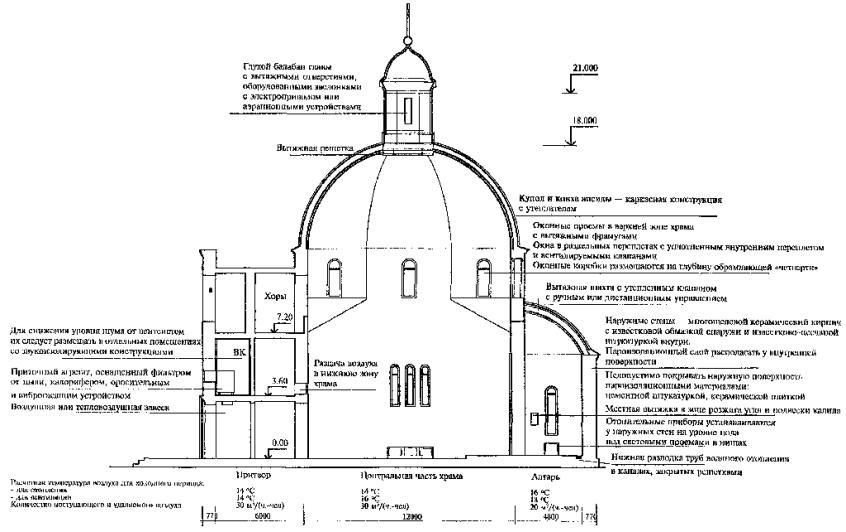 СО2, выделяемого от людей, скорость сгорания свечей V = 1 кг/ч. В периоды проведения праздничных служб при отсутствии механической системы вентиляции в переходный и теплый периоды следует прибегать к естественному проветриванию путем открывания имеющихся проемов с учетом времени года. В случае невозможности обеспечения требуемого воздухообмена естественной системой вентиляции или при специальных требованиях к воздушной среде здание храма обслуживает механическая приточная система вентиляции, производительность которой определяется по показателям тепло- и влагопоступлений, характерным для данного храма. Приточный агрегат оснащается фильтром для очистки от пыли, калорифером и оросительным устройством для нагрева и увлажнения воздуха в зимнее время года. Оросительное устройство при определенных наружных условиях может быть использовано для испарительного охлаждения в теплый период. Приточный воздух в многопридельных храмах рекомендуется распределять зонально в каждый придел. Раздачу воздуха, если позволяют конструкции и интерьер храма, следует производить в нижнюю зону. Подвижность воздуха в нижней зоне центральной части храма не должна превышать 0,3 м/с. При реконструкции зданий храмов для систем вентиляции следует использовать все имеющиеся каналы, продухи, дымоходы и т.д. Удаление воздуха из помещений храма следует предусматривать из верхней зоны с помощью вытяжных отверстий, расположенных в барабанах куполов или через заполнения световых проемов в верхней зоне храма. Такая схема, помимо эффективного удаления влаги, решает проблему отопления барабанов глав, повышая температуру на внутренних поверхностях стен, термическое сопротивление которых значительно ниже, чем для основных конструкций, и предотвращает выпадение конденсата на внутренних поверхностях стен барабанов. Вытяжные отверстия, расположенные в барабанах глав, следует оснащать заслонками с электроприводами дистанционного управления и «незадуваемыми» козырьками или аэрационными устройствами, обеспечивающими заданную кратность воздухообмена. Вытяжную вентиляцию в центральном барабане допускается проектировать механической периодического действия с установкой (с четырех сторон) оконных вентиляторов малой производительности, работающих во взаимосвязи с системой автоматического контроля с гигроскопическими датчиками (учитывающей воздействие ветра и изменение относительной влажности по отношению к установленным значениям). В окнах светового барабана могут быть установлены клапаны-хлопушки, имеющие две жалюзийные решетки: наружную, стационарную для предохранения от проникновения в помещение наружного воздуха и внутреннюю, рабочую, выполненную из легких подвижных лепестков, которые под давлением восходящего потока внутреннего воздуха приподнимаются и выпускают излишки воздуха наружу. Живое сечение клапана рассчитывается на однократный обмен воздуха в храме при скорости движения воздуха 0,3 м/с. Эти клапаны вписываются во фрагменты столярки и устанавливаются в окна, ориентируемые на благоприятные по розе ветров стороны света. В зависимости от направления наружного ветра и его силы работают клапаны, установленные с подветренной стороны, а клапаны, установленные с наветренной стороны, остаются закрытыми. Приток воздуха дол