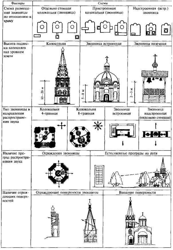Подбор колоколов должен осуществляться в соответствии с акустическим паспортом, в котором указываются количество колоколов, их вес и тональное соответствие в звоне. Для расчета уровня звука колокольного звона принимается звук удара «во вся», когда одновременно ударяют во все колокола. Основное правило развески колоколов - постепенное увеличение веса колоколов справа налево от звонарского помоста. Примеры развески колоколов на звонницах с различным количеством проемов приведены на рис. 66. В колокольном подборе вес большого благовестного колокола должен быть равен суммарному весу всех остальных колоколов. Вес каждого следующего колокола составляет половину веса предыдущего. Балки для подвески малых (зазвонных весом 4 - 52 кг) и средних (весом 52 - 240 кг) колоколов следует располагать в проемах колокольни на высоте 2,5 - 2,7 м от уровня пола. Накрест лежащие балки большого сечения для подвески больших колоколов (весом 240 - 1400 кг) следует размещать внутри яруса колокольни на высоте до 3,5 м с обеспечением расстояния от уровня пола до нижнего пояса колокола не менее 2 м. Малые (зазвонные) колокола располагаются, как правило, в западном проеме колокольни у звонарского помоста, с которого звонарь должен видеть входную зону храма, в т.ч.: начало и окончание Крестного хода, подъезд архиерея. Балки могут использоваться деревянные или металлические, но с обеспечением мероприятий для снижения передачи на балки ударных и вибрационных нагрузок (амортизирующие подкладки из твердой резины под хомут, обшивка досками металлического двутавра или швеллера и др.). Оптимальный размер зазора между балкой и колоколом равен 45 мм. Проемы в колокольнях должны иметь ограждения высотой 1,0 - 1,2 м, служащие для безопасности, а также крепления колокольных тяг. Ограждение проемов может быть глухим или решетчатым для увеличения размера проема и беспрепятственного распространения звука. Пол должен иметь уклоны к проемам в пределах 3 - 5°, служащие для отражения звука и для стока воды. Поверхность пола должна быть в целях предотвращения скольжения шероховатой. В шатровых завершениях колоколен могут устраиваться открытые проемы «слухи», имеющие в основном декоративное значение, а также способствующие, в целях снижения ветровой нагрузки, турбулентности обтекающего воздушного потока. В распространении звука колокольного звона «слухи» практически не играют роли и в расчете уровня звука не учитываются. Рис. 66. Варианты развески колоколов На верхних закрытых ярусах колоколен возможна установка курантов с механической передачей к тягам колоколов. Применение технических средств звукоусиления колокольных звонов не рекомендуется, а применение вместо колокольных звонов технических средств звуковоспроизведения не допускается. Подъем колоколов на колокольню может осуществляться в процессе строительства колокольни подачей снизу до устройства перекрытий или сверху до устройства покрытия. В современной практике храмостроительства, когда колокола подвешивают после возведения колокольни, подъем их на колокольню осуществляется с помощью крана и выносной площадки с подачей сбоку через арочный проем. В проем устанавливают две двутавровые балки, которые надежно крепятся к конструкции колокольни. Вылет балок наружу должен немного превышать диаметр самого большого 
