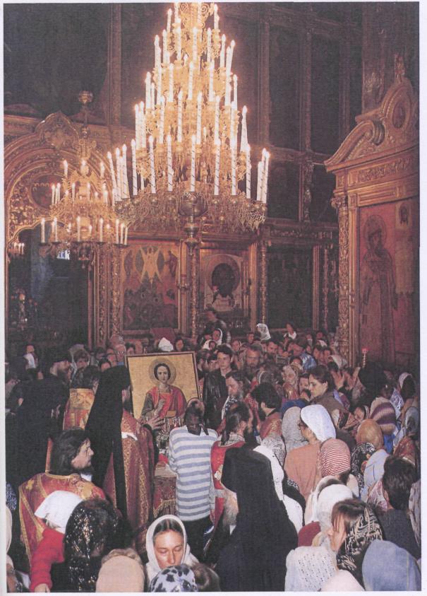 Утреня Утреннее богослужение является продолжением вечернего и касается времени новозаветного: явления Христа в мир, Его проповеди и Воскресения. В продолжение утрени большое значение имеет смена освещения храма. Погашение светильников во время чтения псалмов напоминает о той ночи, во время которой родился Христос, а зажжение светильников знаменует явление Христа, просвещающего всех людей. В храме зажигаются все свечи и паникадило, открываются Царские врата и священник, предшествуемый диаконом со свечой и прислужниками, выходит из алтаря и совершает каждение по всему храму. В центре храма совершается чтение Евангелия, которое выносится диаконом через Царские врата. Далее Евангелие возлагается на аналое для целования. Верующие прикладываются к Евангелию и праздничной иконе, после чего священник помазывает их елеем, благословенным на литии, и раздает освященные кусочки хлеба. В конце всенощной читается 1-й час. В это время свечи гасятся и храм снова погружается в полумрак. Литургия Литургия - главное богослужение Православной Церкви, во время которого человек соединяется с Богом через Таинство Причащения (или Евхаристии). В конце Проскомидии (первая часть Литургии) совершается каждение всего храма с выходом священнослужителя из алтаря северными вратами и входом через южные врата. Важными моментами Литургии являются «Малый» и «Великий» входы, во время которых священник выносит Евангелие и Дары через северные врата на солею и далее снова в алтарь через Царские врата. Молящиеся, видя в переносимом Евангелии как бы Самого Иисуса Христа, явившегося в мир на проповедь, поклоняются Ему. Перед чтением Евангелия диакон кадит алтарь, иконостас и молящихся. В конце Литургии оглашенных некрещеные в древности покидали храм. Во время Великого входа на Литургии верных священнослужащие в алтаре подходят к жертвеннику, берут дискос и Чашу и, предваряемые свечой, несут их через северные, а затем через Царские врата на престол. Великий вход напоминает верующим торжественный вход Спасителя в Иерусалим и шествие Его с Крестом на добровольные страдания. После совершения в алтаре священнодействий Царские врата открываются, священник выходит из алтаря на амвон, держа в руках Чашу со Святыми Дарами, которым молящиеся благоговейно поклоняются, как Самому воскресшему Спасителю. Начинается причащение верующих с амвона солеи, во время которого происходит таинственное соединение человека с Богом, а весь храм символизирует собой обновленные небо и землю, Царство Небесное, возвращенный человеку Рай. Приняв Святые Дары, причастники идут в приготовленное место и запивают «теплотой». В конце Литургии молящиеся прикладываются к Кресту и выходят из храма. Если в храме совершаются в один день две Литургии, то они должны совершаться на разных престолах (в разных алтарях храма или на приставном престоле в том же алтаре). В особых случаях разрешается совершать Литургию на переносных антиминсах и престолах в часовнях и других приспособленных зданиях и сооружениях, а также на открытом месте, в том числе с применением инвентарного алтаря в виде палатки. Колокольный звон Колокольный звон является неотъемлемой частью православного богослужения. Колокольным звоном начинается и заканчивается служба в церкви, звоном сопровождаются самые важные ее моме