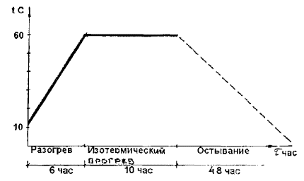 В данной карте приняты средние значения: сечение кабеля индуктора - 25 мм2, напряжение - 75 В, сила тока - 115 А, количество витков индуктора - 78. Потребная электрическая мощность с учетом расчетной температуры наружного воздуха -15 °С и сечения кабеля 25 мм2 в соответствии с температурным режимом прогрева составит на одну колонну: на предварительный отогрев арматуры и опалубки - 8,62 кВт×час; на разогрев бетонной смеси до 60 °С - 51,75 кВт×час; на изотермический прогрев - 66,3 кВт×час; общая потребность - 126,67 кВт×час. 2.3. Подготовку оснований и укладку бетонной смеси производят с учетом следующих требований: при температуре воздуха ниже -10 °С арматуру диаметром более 25 мм, а также арматуру прокатных профилей и крупные металлические закладные детали при наличии на них наледи предварительно отогревают включением индуктора. В остальных случаях допускается укладка бетонной смеси без предварительного обогрева арматуры. Удаление наледи с помощью пара или горячей воды не допускается; укладку бетонной смеси производят непрерывно, без перевалок, средствами, обеспечивающими минимальное охлаждение смеси при ее подаче; температура бетонной смеси, уложенной в опалубку, должна быть не ниже +5 °С. На время укладки бетонной смеси индуктор отключают. 2.4. Открытые поверхности укрывают гидроизоляцией (полиэтиленовая пленка) и теплоизоляцией (минеральная вата толщиной 50 мм) сразу после укладки бетонной смеси в конструкцию. Кроме того укрывают выпуски арматуры. 2.5. Подают напряжение на систему индукционного нагрева. Нагрев бетонируемых колонн производят со скоростью разогрева 8 °С/час в соответствии с графиком температурного режима, приведенного ниже:
