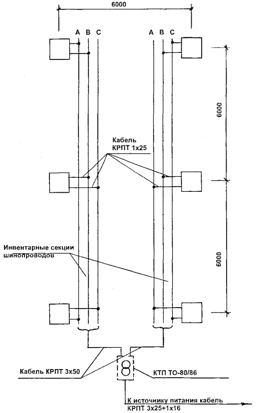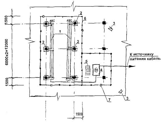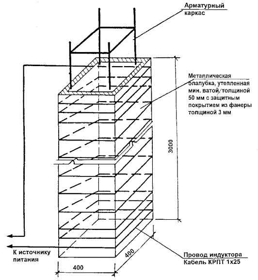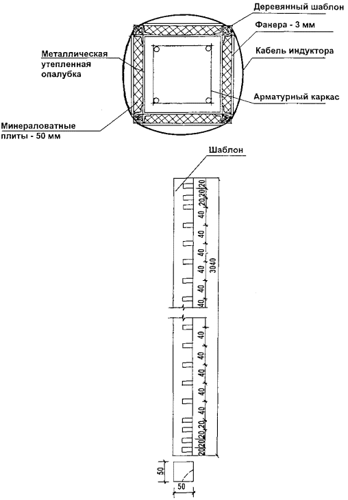 2.12. Операции по индукционному прогреву бетонируемых конструкций выполняют в следующей последовательности: бетонщики III р. укладывают кабель по шаблонам согласно схеме (рис. 3); электромонтер V р. производит разделку концов жил кабеля, подсоединяет его к трансформаторной подстанции КТП ТО-80/86; электромонтер III р. расставляет инвентарные секции шинопроводов вдоль захватки, соединяет их между собой; после присоединения кабеля электромонтер V р. подсоединяет секции шинопроводов к трансформаторной подстанции и производит ее заземление. Он же опробывает работу трансформаторной подстанции на холостом ходу; после этого электромонтер III р. подсоединяет кабели индукторов к секциям шинопровода; после укладки бетона в конструкцию бетонщики III р. устраивают гидро- и теплоизоляцию открытых поверхностей; подают напряжение на систему индукционного прогрева. Рекомендации по энергосбережению. 2.13. В целях энергосбережения при индукционном прогреве монолитных конструкций рекомендуется: - не допускать возможности охлаждения бетонной смеси более чем установлено технологическим расчетом, нарушения однородности и снижения заданной подвижности на месте укладки при определении средств и продолжительности транспортирования бетонной смеси; - применять бетонные смеси возможно более высокой относительной прочности при малой продолжительности прогрева (портландцемент, быстротвердеющий портландцемент); - применять химические добавки для сокращения продолжительности термообработки бетона и получения повышенной прочности, приобретаемой бетоном сразу после прогрева; - применять максимально допустимую температуру термообработки бетона с учетом нарастания прочности бетона при остывании; - надежно производить теплоизоляцию поверхностей бетона и опалубки подвергающихся охлаждению; - соблюдать режим электрообработки; - следить за качеством и плотностью соединений контактов кабелей; - сохранять теплозащитные маты в сухом состоянии. 3. ТРЕБОВАНИЯ К КАЧЕСТВУ И ПРИЕМКЕ РАБОТ3.1. Контроль качества индукционного прогрева монолитной конструкции при отрицательных температурах воздуха производят в соответствии с требованиями СНиП 3.01.01-85* «Организация строительного производства», СНиП III-4-80* «Техника безопасности в строительстве» и СНиП 3.03.01-87 «Несущие и ограждающие конструкции». 3.2. Производственный контроль качества индукционного прогрева осуществляют прорабы и мастера с участием специалистов энергетических служб строительных организаций. 3.3. Производственный контроль включает входной контроль электротехнического оборудования, эксплуатационных материалов и бетонной смеси, операционный контроль отдельных производственных процессов и приемочный контроль качества монолитной конструкции. 3.4. При входном контроле электротехнического оборудования, эксплуатационных материалов и бетонной смеси проверяют внешним осмотром их соответствие нормативным и проектным требованиям, а также наличие и содержание паспортов, сертификатов и других сопроводительных документов. При операционном контроле проверяют соблюдение состава подготовительных операций, технологии наладки электрообогревающего оборудования и устройств, укладки бетона в тело конструкции в соответствии с требованиями СНиП, процесс индукционного прогрева, температуру, силу 