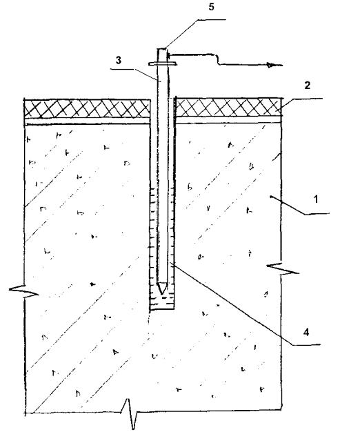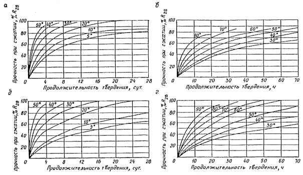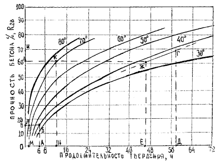 Контроль температуры обогреваемого бетона производят техническими термометрами или дистанционно с помощью термодатчиков, устанавливаемых в скважину (рис. 6 и 7). Температуру бетона измеряют в процессе изотермического обогрева не реже чем через 2 часа. Скорость подъема температуры не должна превышать 8 °С/час. Скорость разогрева бетонной смеси регулируют повышением или понижением напряжения на низкой стороне трансформатора. Температуру бетона в процессе разогрева необходимо контролировать не реже чем через 1 час. 2.6. Не реже двух раз в смену, а в первые три часа с начала обогрева бетона через каждый час, измеряют силу тока и напряжение в питающей цепи. Визуально проверяют отсутствие искрения в местах электрических соединений. При изменении температуры наружного воздуха в процессе обогрева конструкции выше или ниже расчетной, соответственно понижается или повышается напряжение в электрической сети. 2.7. Скорость остывания бетона по окончании тепловой обработки для конструкций с модулем поверхности Мп = 5 - 10 и выше 10 должна быть соответственно не более 5 и 10 °С/час. Один-два раза в смену замеряют температуру наружного воздуха, результаты замеров фиксируются в журнале работ. 2.8. Прочность бетона, как правило, проверяют по фактическому температурному режиму на наименее нагретых участках. Рекомендуется после распалубливания монолитной конструкции определять прочность обогретого бетона, имеющего положительную температуру с помощью молотка конструкции НИИМосстроя, ультразвуковым способом или, высверливанием и испытанием кернов. Набор прочности бетона при различных температурах его выдерживания определяется графиком (рис. 8). Пример определения прочности бетона по графику приведены на рис. 9. 2.9. Теплоизоляция и опалубка могут быть сняты не ранее того момента, когда температура бетона в наружных слоях конструкции достигает плюс 5 °С и не позже, чем слои остынут до 0 °С. Примерзания опалубки и теплозащиты к бетону не допускается. 2.10. Для предотвращения появления трещин в бетонируемых конструкциях перепад температур между открытой поверхностью бетона и наружным воздухом не должен превышать: 20 °С - для монолитных конструкций с модулем поверхности Мп < 5; 30 °С - для монолитных конструкций с модулем поверхности Мп > 5. В случае невозможности соблюдения указанных условий поверхность бетона после распалубливания укрывают (брезентом, толью, щитами и т.д.). 2.11. Индукционный прогрев конструкций выполняет звено из 4-х человек (таблица 2). Распределение операций по исполнителям Таблица 2