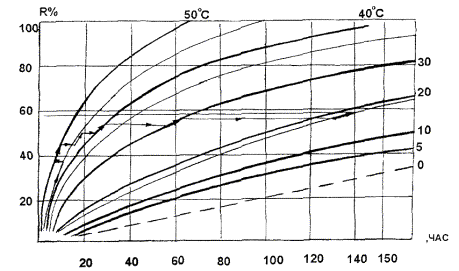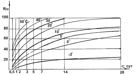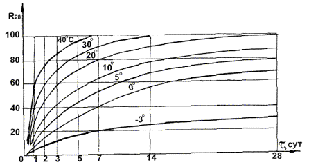 б) по таблице 6 определяется начальная температура бетона (после укладки и уплотнения) tн.б. при h = 500 мм, t = 10 мин. и перепада температур Dt = 1 °С, снижение температуры t1 °C = 0,04 °С при заданном перепаде Dt = tтр - tнв = 30 - (-10) = 40 °С t40 °C = 0,04 ´ 40 = 1,6 °С tнб = 30 - 1,6 = 28,4 °С » 28 °С в) по таблице 2 для бетона марки 300 на портландцементе марки 400 с расходом цемента 200 кг/м3 при температуре наружного воздуха tн.в. = -10 °С Мп = 4 и начальной температурой бетона tнб = 28 °С находящейся между значениями tнб = 20 °С и tнб = 30 °С методом интерполяции определяются: продолжительность остывания t0 = (81 - 67) ´ 2/10 + 67 » 70 ч. коэффициент теплопередачи К = 5,35 - (5,35 - 3,75) ´ 2/10 = 5,03 Вт/м2 °С г) по найденному коэффициенту «К» по рис. 6 определяется конструкция опалубки и тепловая защита: при «К» = 5,03 Вт/м2 °С подходит тип опалубки II, тепловая защита по рис. 6. Приложение 3ПРИМЕР ОПРЕДЕЛЕНИЯ ПРОЧНОСТИ БЕТОНАБетон марки класса В25 Режим остывания: 12 часов при 45 °С 3 часа при 50 °С 3 часа при 43 °С 6 часов при 35 °С 7 часов при 30 °С 14 часов при 18 °С Отсчет прочности в % от R28 ведется по оси ординат по соответствующей температурной кривой (для данного интервала). Переход на последующие средние температуры твердения бетона осуществляется параллельно оси абсцисс. Отсчет времени производится путем суммирования его интервалов, соответствующих средним температурам.