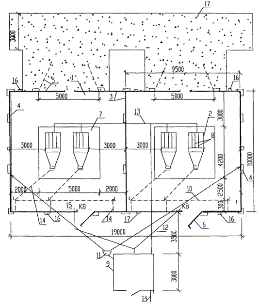 1 - площадка для установки электроразогрева бетонной смеси; 2 - бункер разогрева; 3 - ограждение; 4 - перемычки медные; 5 - ворота; 6 - калитка; 7 - настил деревянный; 8 - электроды; 9 - помещение дежурного электрика; 10 - контур заземления; 11 - прожектор ПЗС-35; 12 - кабель силовой ШРПС-4´15 мм2; 13 - токопроводящий кабель; 14 - кабель силовой 2 (КРТП-3´10 + 1´35) от РП; 15 - КB - конечный выключатель; 16 - предупредительный сигнал; 17 - временная автодорога. Рис. 1 Схема организации рабочей зоны при предварительном электроразогреве бетона в бункерах V = l,0 м3 Рис. 2. График нарастания прочности бетона класса В15, В25 на портландцементе марки 400 Рис. 3. График нарастания прочности бетона класса В35 на портландцементе марки 500 Рис. 4. Схема расстановки температурных скважин