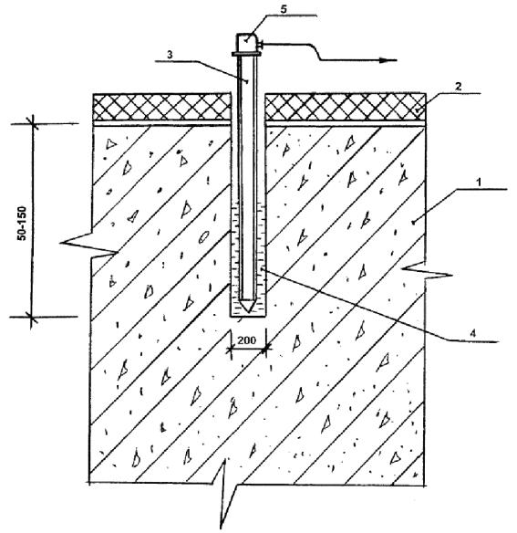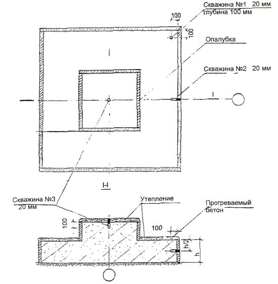 3.5. При производстве бетонных работ измеряется температура: наружного воздуха - не реже двух раз в смену; бетонной смеси: на месте ее приготовления и перед выгрузкой на месте укладки; в уложенном слое до перекрытия новым слоем (не допускается снижение температуры бетона в уложенном слое ниже 5 °С); после укладки в конструкцию (через каждые два часа в первые сутки после окончания бетонирования и затем не реже двух раз в смену в течение трех суток твердения, а в последующие сутки один раз в смену в течение периода остывания бетона до 0 °С). 3.6. Температура бетона в конструкции измеряется техническими термометрами или термодатчиками (рис. 6). 3.7. Измерение температуры бетона термометрами осуществляется через наклонные под углом 45° скважины диаметром 20 мм, которые заливаются на 1/4 своей длины маслом. Длина хвостовой части термометра, погруженного в скважину, должна позволять снимать его показания, не извлекая термометр из скважины. Глубина скважины при угле наклона 45° составляет 50 - 100 мм. Все отверстия для измерения температуры бетона пронумеровываются и наносятся на схемы конструктивного элемента. 3.8. Показатели температурной смеси перед укладкой в опалубку в процессе твердения, а также температуры наружного воздуха записываются в специальный журнал в сроки, указанные в п. 3.5. 3.9. Прочность бетона после распалубливания рекомендуется определять с помощью молотка конструкции НИИ Мосстроя, ультразвуковым способом или высверливанием и испытанием кернов. Снижение температуры бетона за время укладки и уплотнения (при перепаде температур 1 °С) Таблица 6