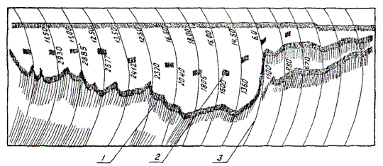 ´ Далее против часовой стрелки плавно поворачивают диск диапазона глубин (рис. 6) до тех пор, пока не получат запись сигнала, отраженного от дна. При появлении отраженного сигнала отмечают карандашом на электротермической бумаге величину смещения диска, например, против деления 40. Карандашные отметки на ленте вдоль записи глубин повторяют примерно через 1-1,5 см. При вычислении глубин учитывают смещение начальной линии, - в приведенном примере на величину (40-10):3,8 = 7,9 м, - которую следует прибавлять к отсчетам по батиграмме. Детальность промера6.15. Детальность промера определяется вертикальным и горизонтальным масштабом батиграммы. Вертикальный масштаб устанавливают по результатам тарирования одним из способов, указанных в пп. 2.17-2.18. 6.16. Горизонтальный масштаб профиля батиграммы зависит от скорости протяжки бумаги vб и скорости перемещения промерного судна vп и может быть определен по отношению
